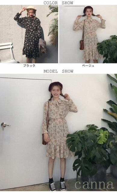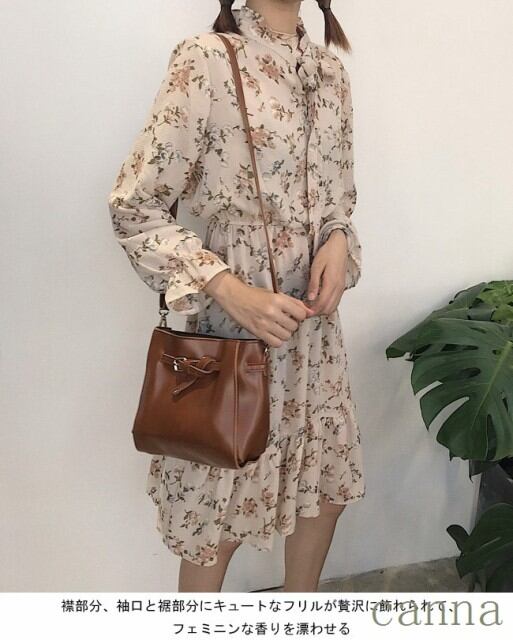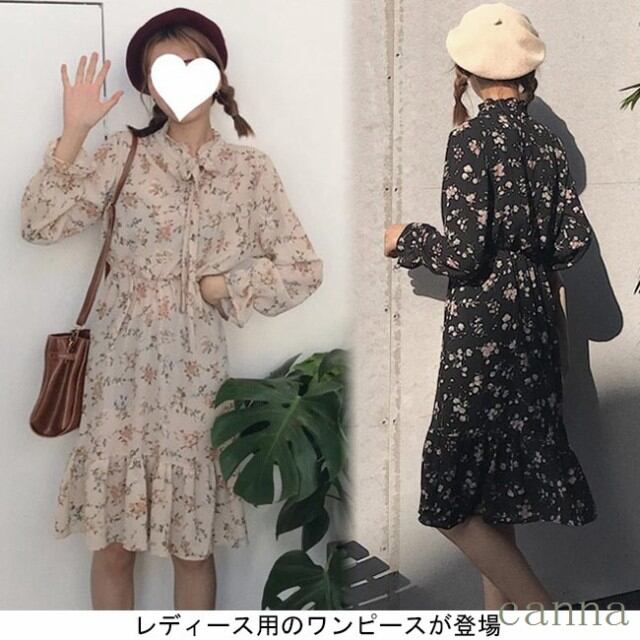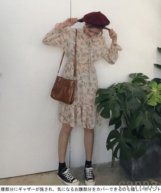 レディース 花柄 ワンピース 長袖 膝丈 女性用 Aラインスカート ギャザー付き フリル付き 春秋物 レトロ 通勤 キュート