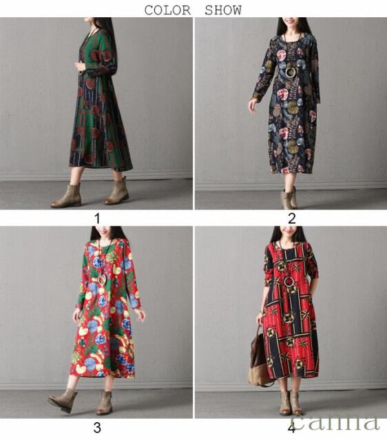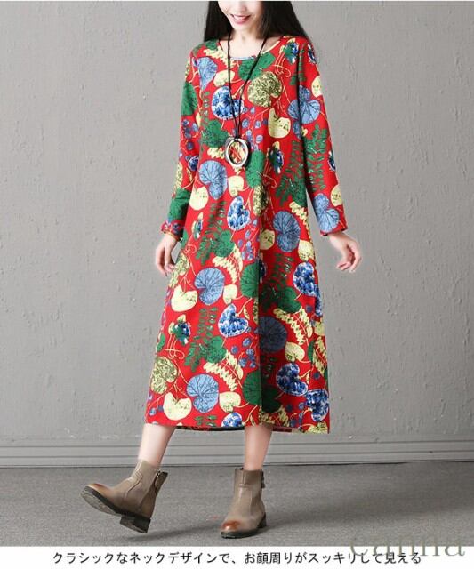 レディース ロング丈ワンピース 長袖 花柄プリント マキシ丈 春秋 秋服 ゆるシルエット お洒落 カジュアル キレイめ フレアワンピ ポケット付き