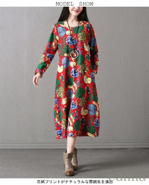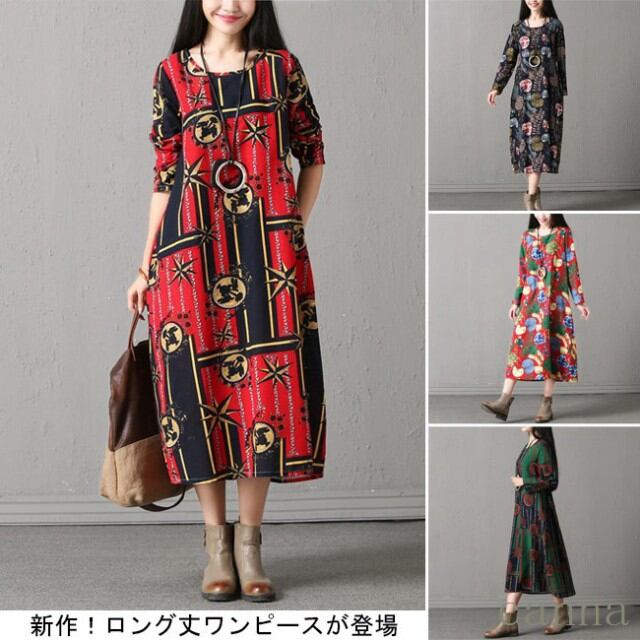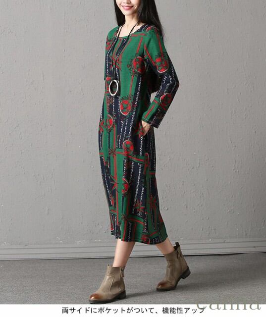レディース ロング丈ワンピース 長袖ワンピース 花柄プリント マキシ丈 春秋 秋服 ゆるシルエット お洒落 カジュアル キレイめ フレアワンピ ポケット付き
