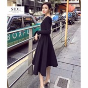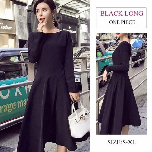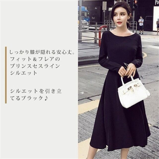 ブラックフォーマル ワンピース 長袖 レディース パーティードレス ロング 袖あり Aライン フレア 無地 黒 シンプル 20代