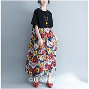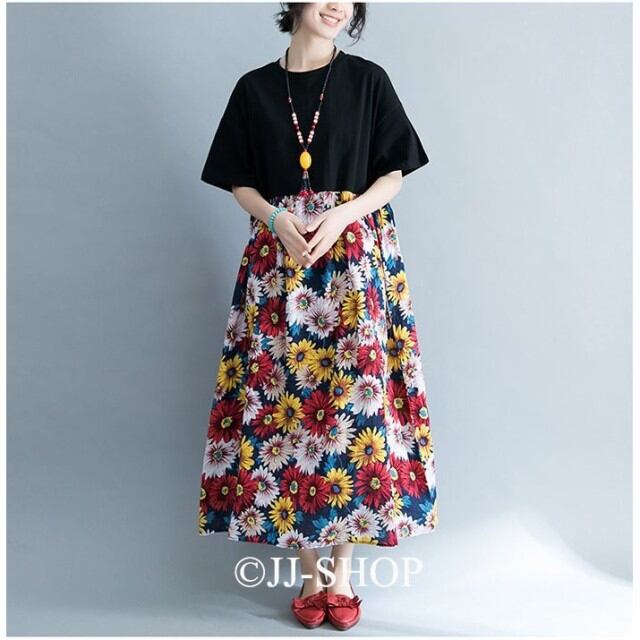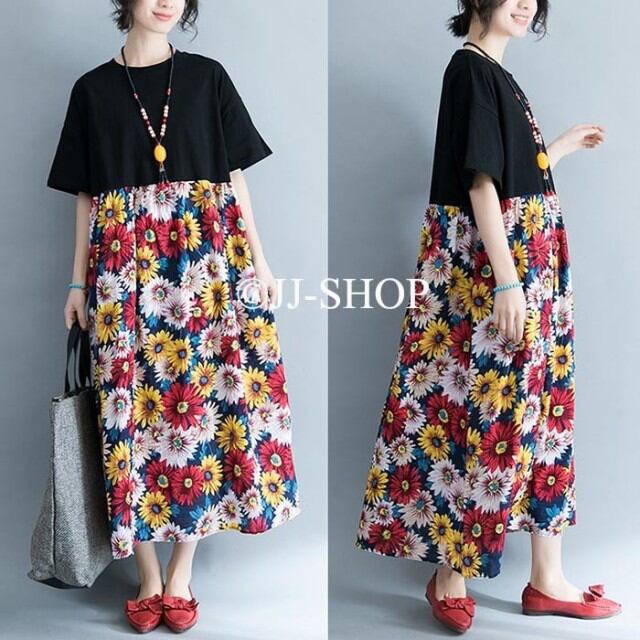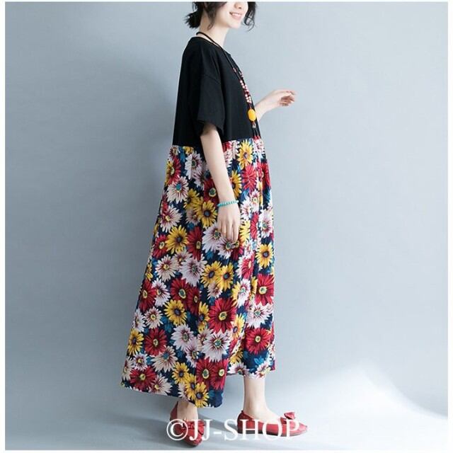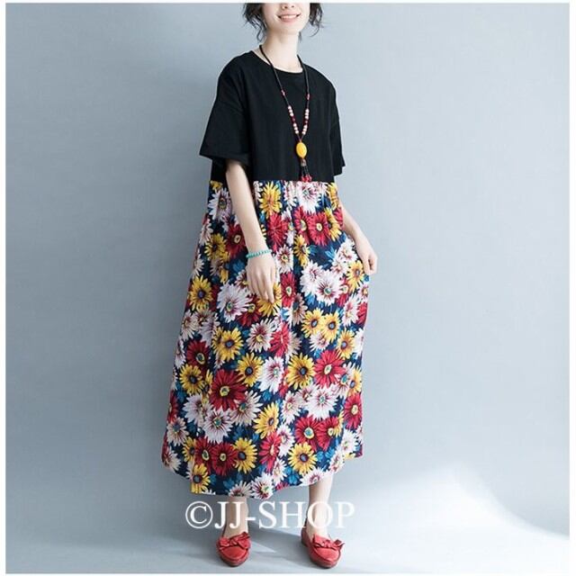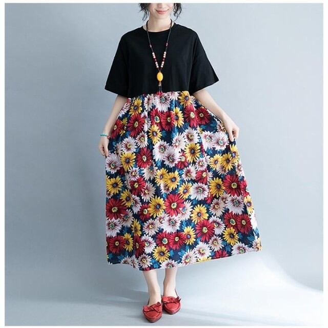 ワンピース チュニック レディース 半袖 夏 ロング丈 花柄 Aライン 体型カバー 大きいサイズ ゆったり ナチュラル 綿麻 夏コーデ ワンピース チュニック