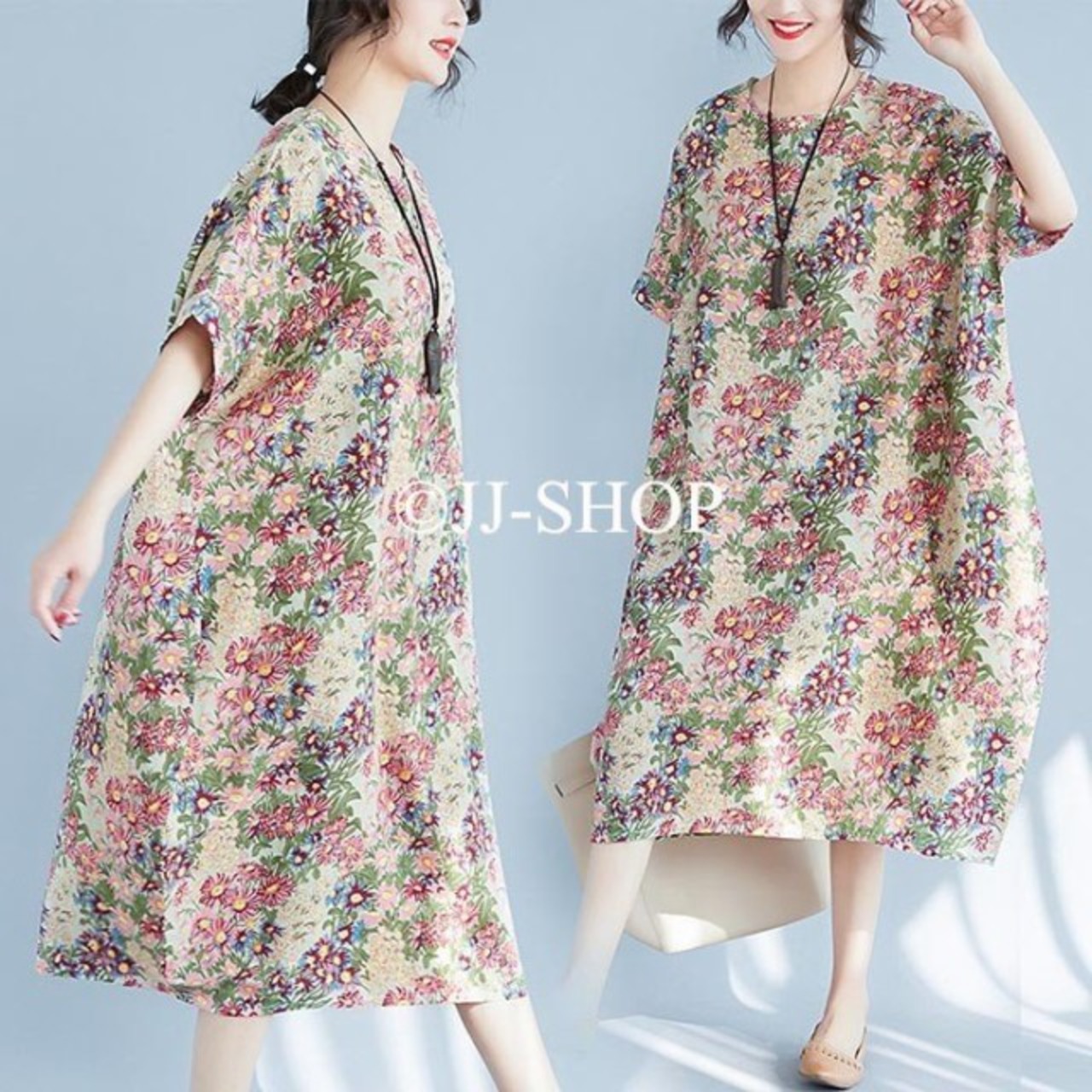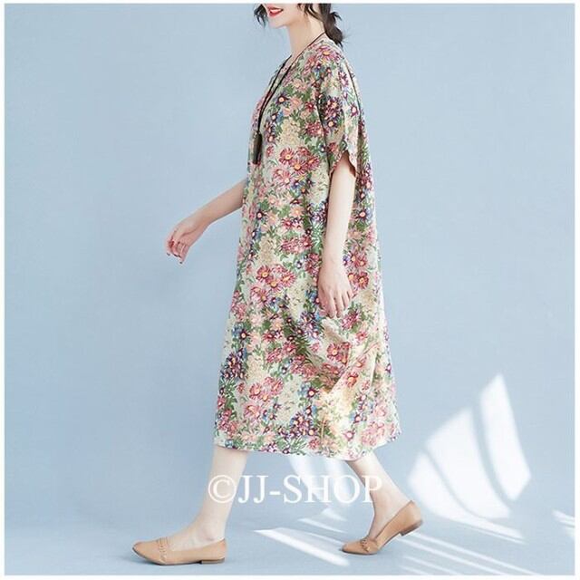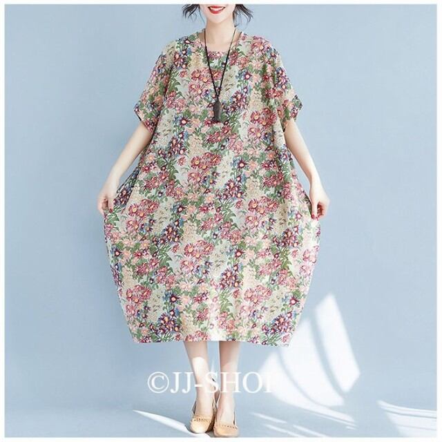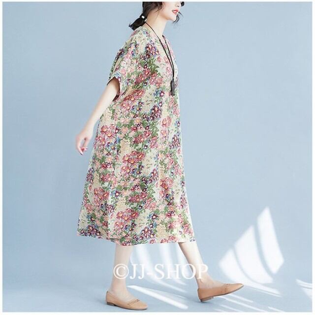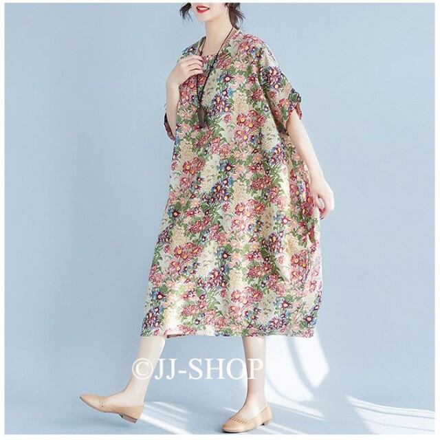 春ワンピース 半袖ワンピース リネンワンピース ロング丈ワンピース レディース マキシ丈 総柄 花柄 ゆったり 体型カバー 涼しい 森ガール
