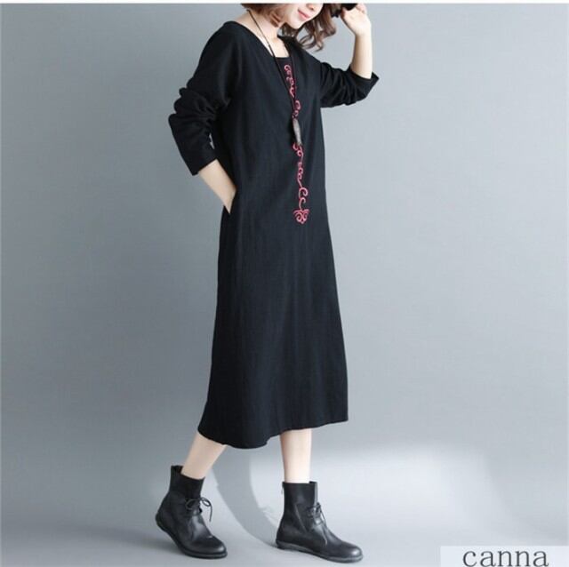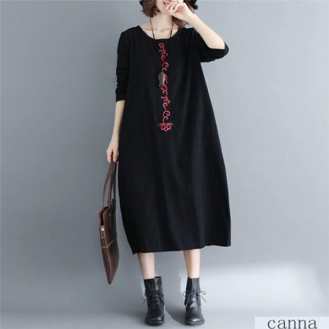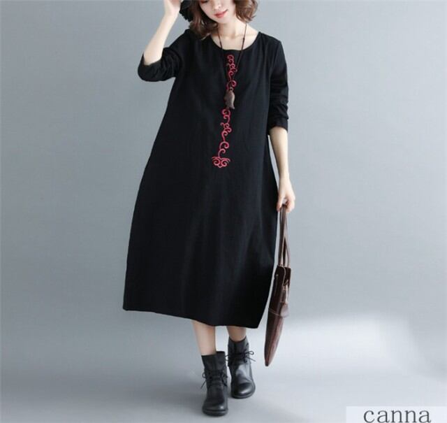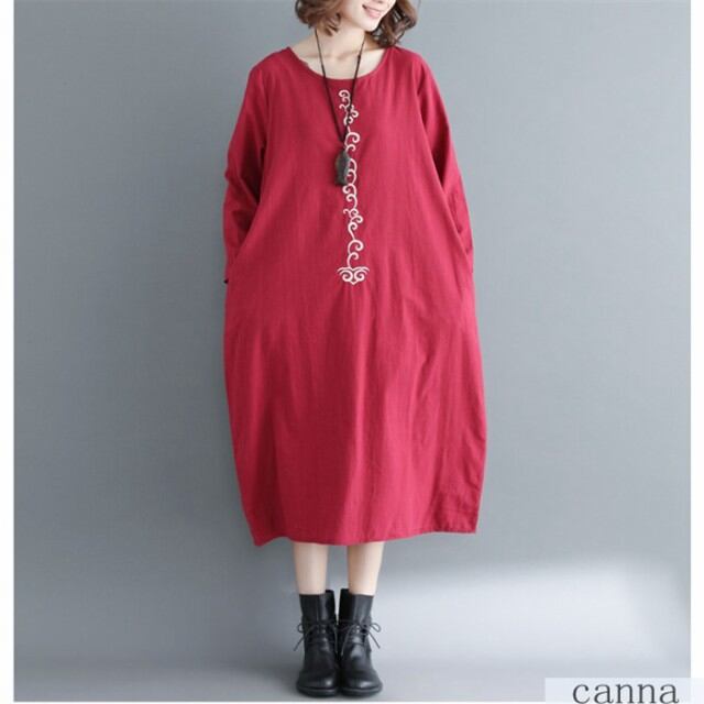綿麻混ワンピース ワンピース ロング レディース マキシワンピース ロング丈 ワンピース コットンリネン 体型カバー 長袖 ワンピース チュニック ロングワンピース 刺繍 森ガール ナチュラル服 秋 冬 秋ワンピース ゆったり 大きいサイズ 着痩せ 30代 40代 50代 60代 お洒落 おしゃれ オシャレ ゆるっと 旅行 ママワンピース 母親 ママ ワンピース 黒 赤 M L 2L 3L