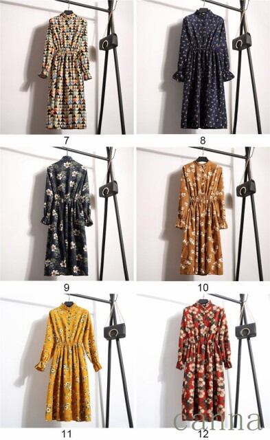 レディース ワンピース 長袖 膝丈 花柄 コーデュロイ 女性用 春秋物 フリル袖口 パフスリーブ フェミニン ギャザー付き 体型カバー