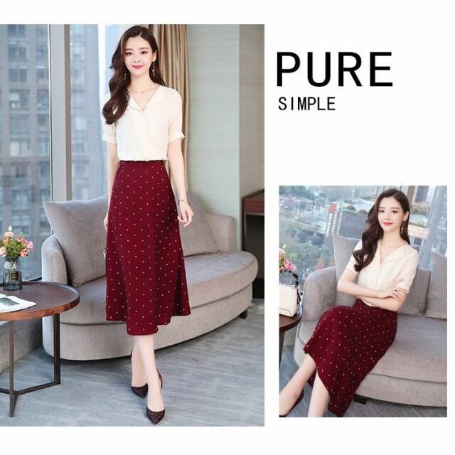 連携キーワード:ワンピースセットアップ レディース 40代 春夏 半袖ワンピース ドット柄 シ膝丈スカートセットアップ vネック ブラウス 通勤 着痩せ オシャレワンピース