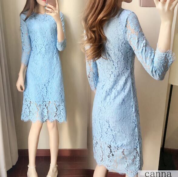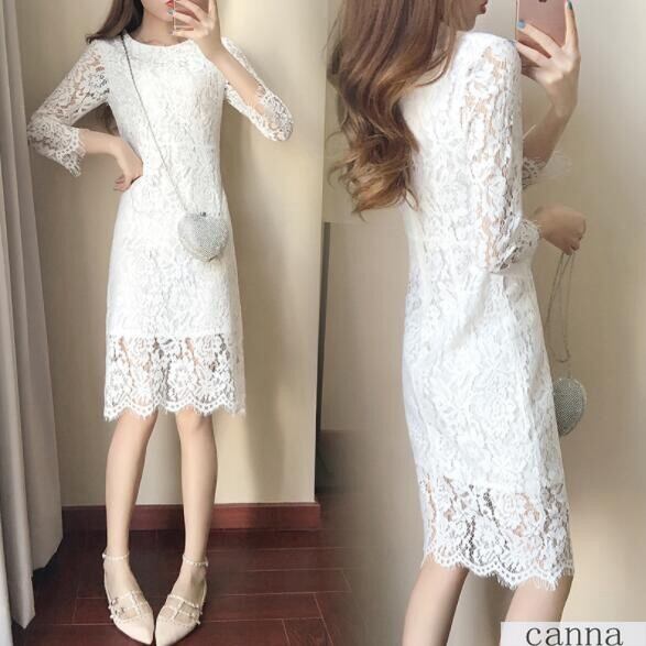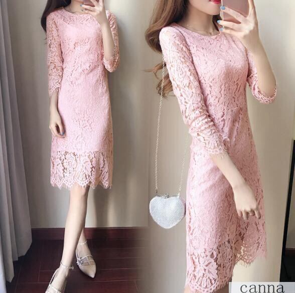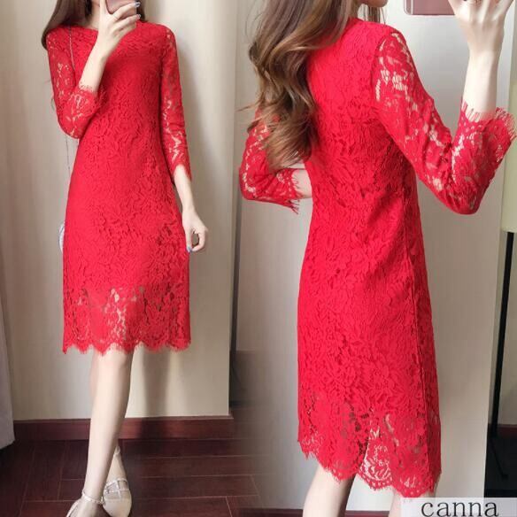 レディース ワンピース 膝下丈 レース 長袖 無地 タイト 着痩せ 5色 きれいめ 大きいサイズ 通勤 OL 結婚式 春秋