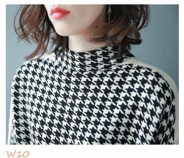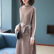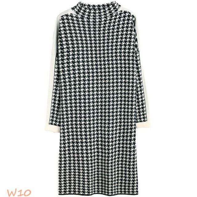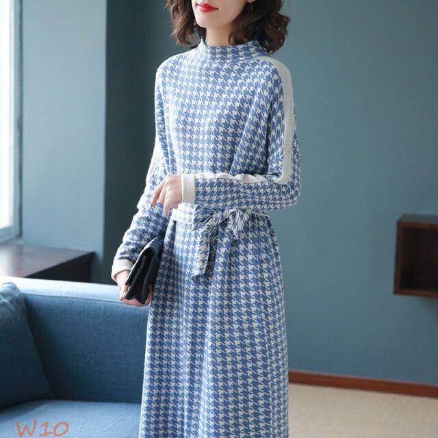ワンピース レデイース 秋 千鳥柄 Aライン 上品 ニットワンピース 冬 ベルト付き 長袖 着痩せ ハイネック 体型カバー 大人 膝丈
