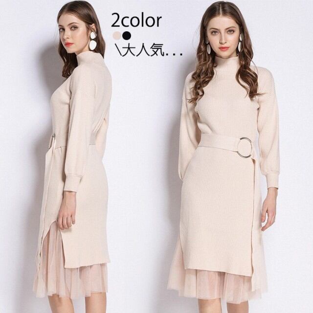 プリーツ入りニットワンピース レディース ワンピース ニット ロング 長袖 マキシ スリット プリーツ