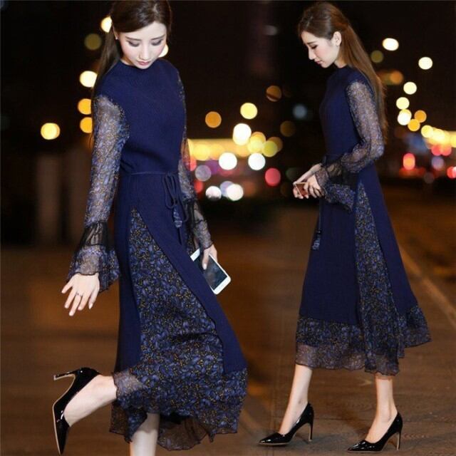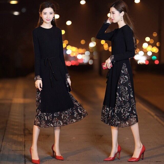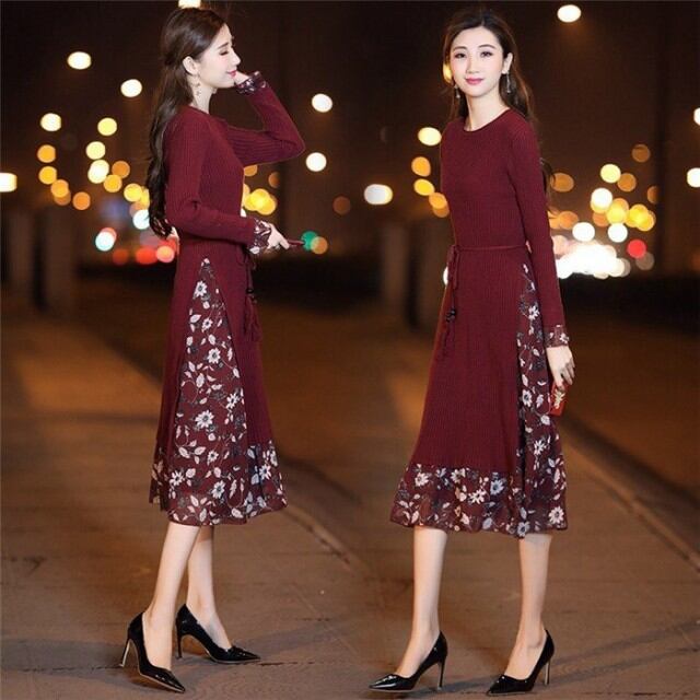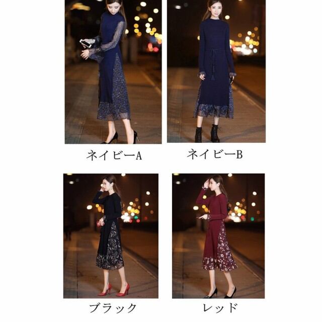 連携キーワード:ワンピース レディース 秋冬 マキシ丈ワンピース きれいめ ニット 長袖 セーター 切り替え マキシ丈ワンピース 花柄 リボン 通勤 オシャレ 着痩せ 上品 3色