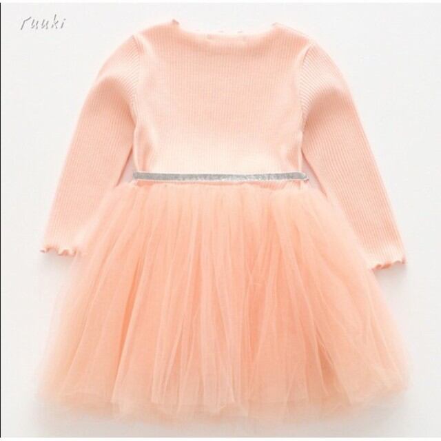 韓国子供服 秋冬新作 キッズ ワンピース 切替チュールワンピース チュールスカート 子供服 女の子 ジュニア 可愛い 星リボン付き 長袖ワンピース