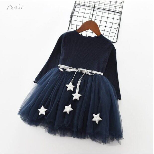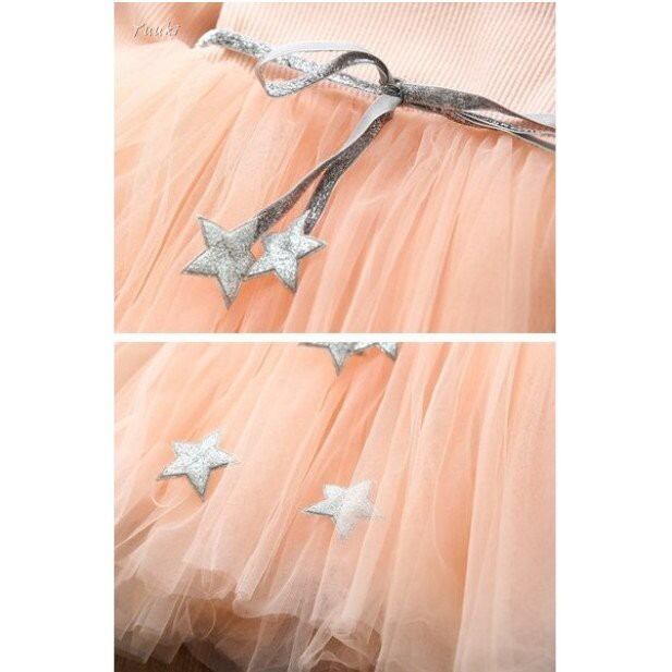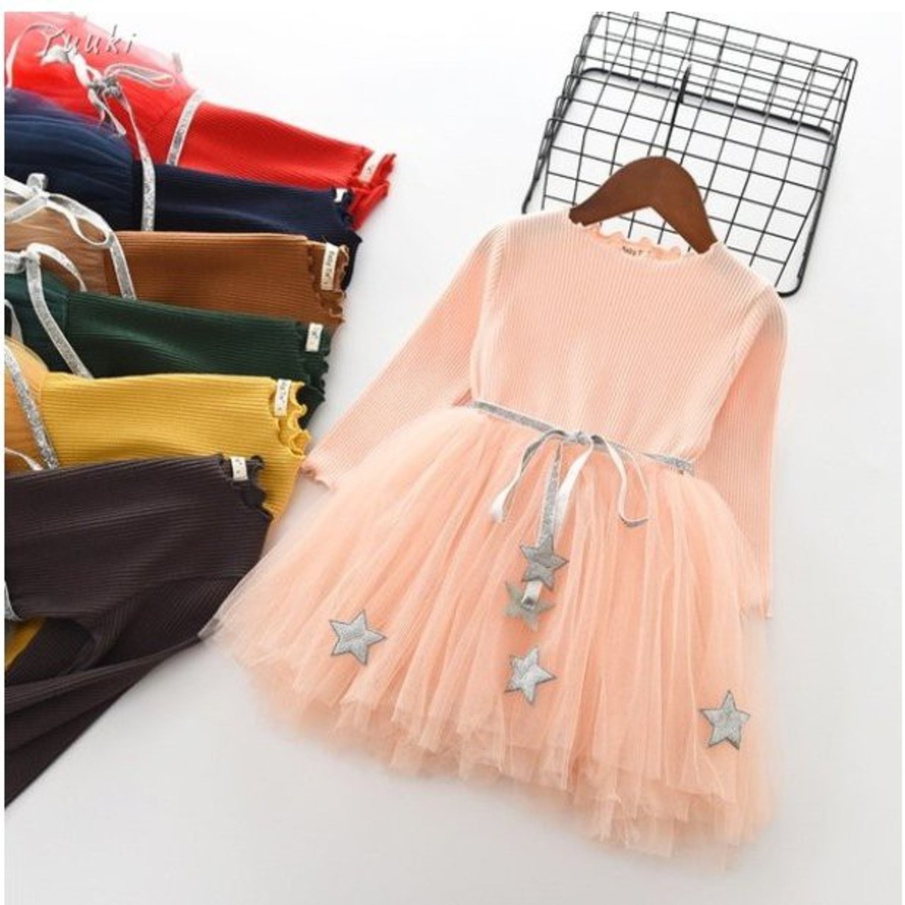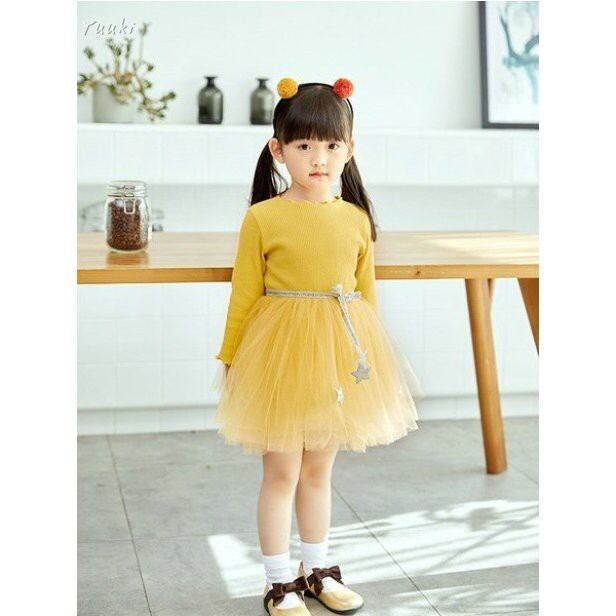 韓国子供服 秋冬新作 キッズ ワンピース 切替チュールワンピース チュールスカート 子供服 女の子 ジュニア 可愛い 星リボン付き