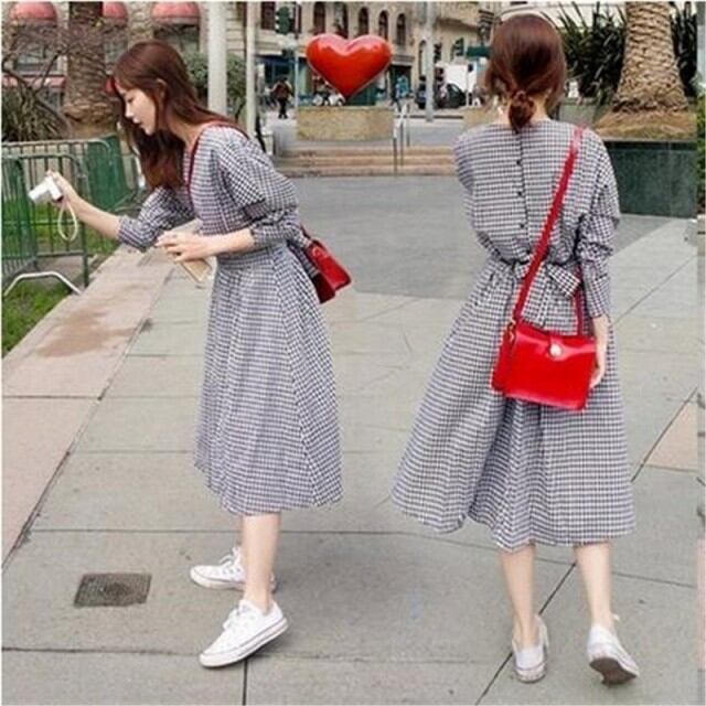 連携キーワード:ワンピース レディース 春夏 膝丈ワンピース きれいめ チェック柄 ワンピース長袖 リボン 通勤 大人可愛い オシャレ ロング丈ワンピース 着痩せ 韓国風
