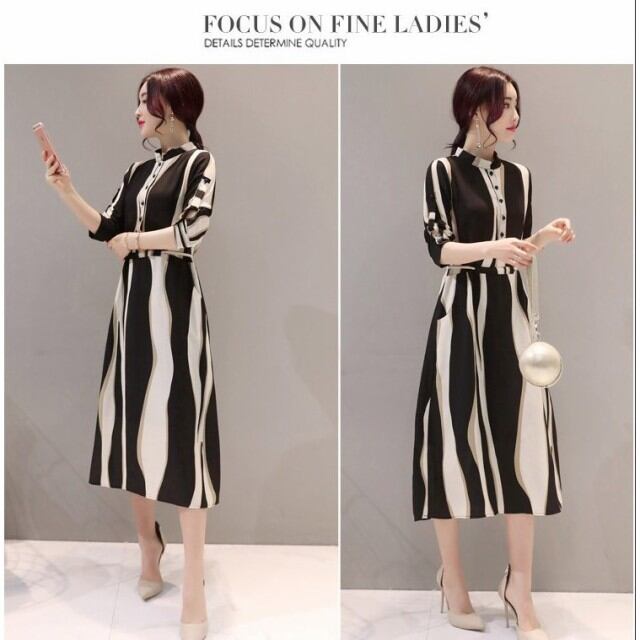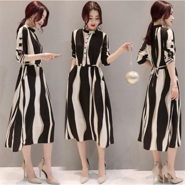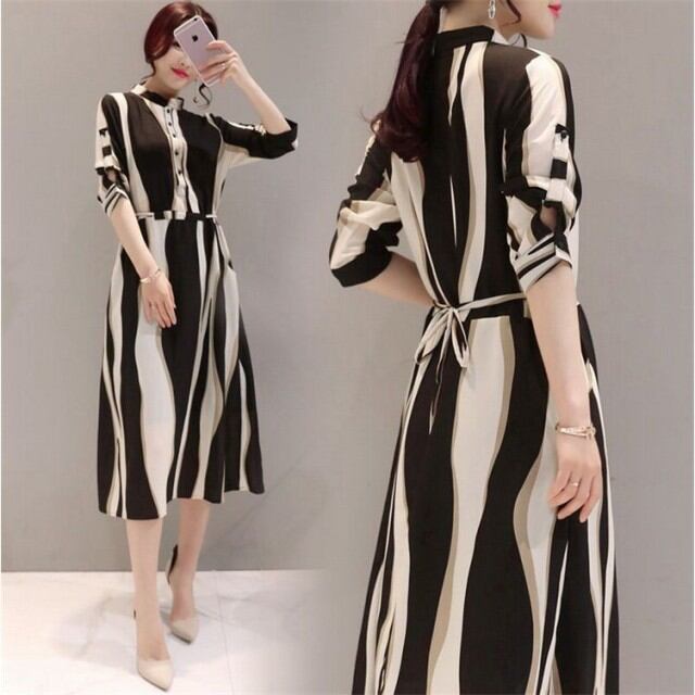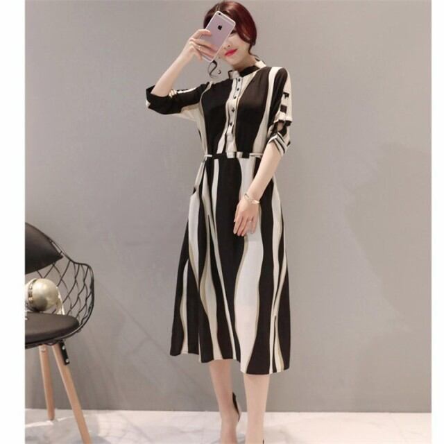 ワンピース レディース 春夏 膝丈ワンピース シフォンドレス ボーダー柄 結婚式 ロング 五分袖 マキシワンピ ワンピース オシャレ 上品 着痩せ