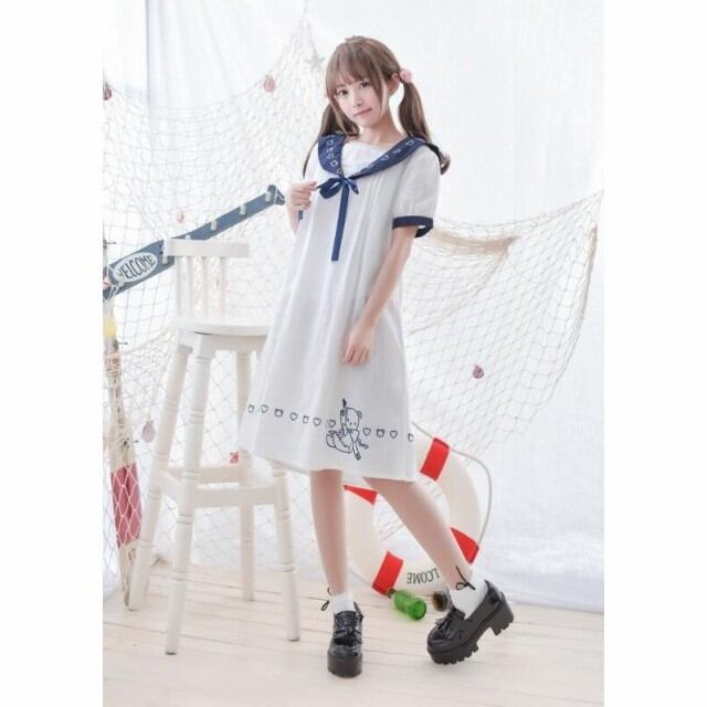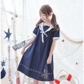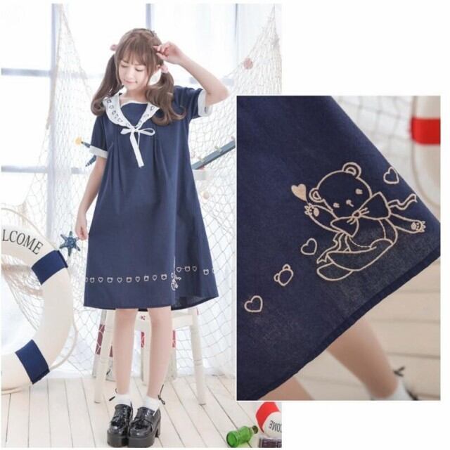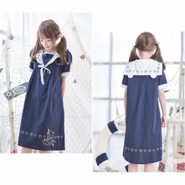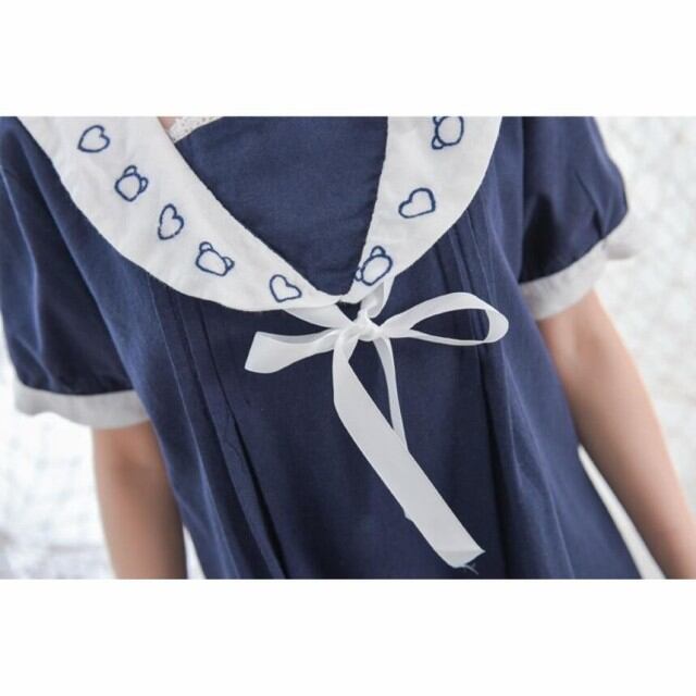 学園風レディースセーラー服ワンピース 半袖 チュニック学生服 森ガール系 海軍風 熊ちゃん
