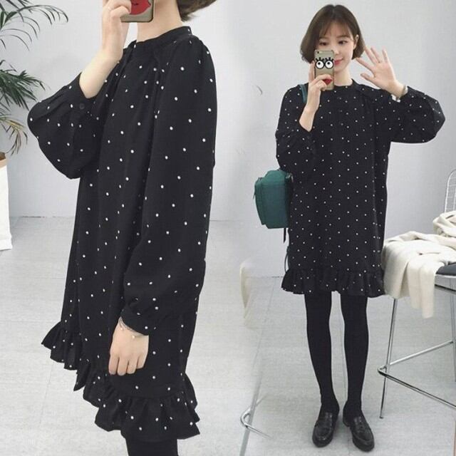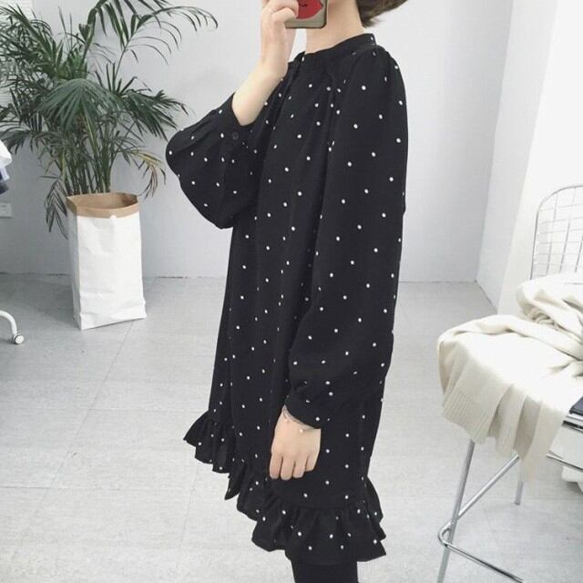 ワンピース レディース ワンピース 秋 きれいめ膝丈ワンピース 上品 長袖 ドット柄ワンピースチュニック 着痩せ 通勤 結婚式ドレス お出かけ 韓国風