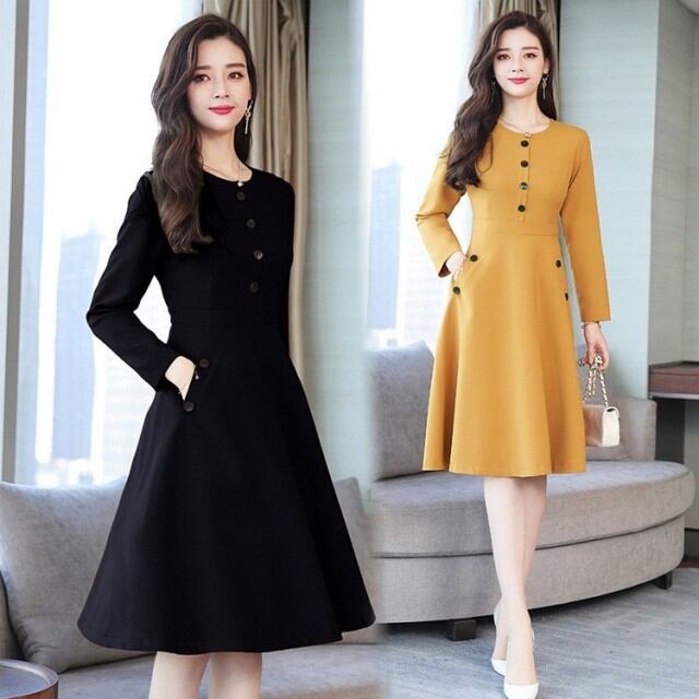 ワンピース レディース 秋冬 膝丈ワンピース きれいめ 上品 無地 長袖 Aラインワンピース 通勤 着痩せ ロング丈ワンピース 結婚式ドレス オシャレ 4色