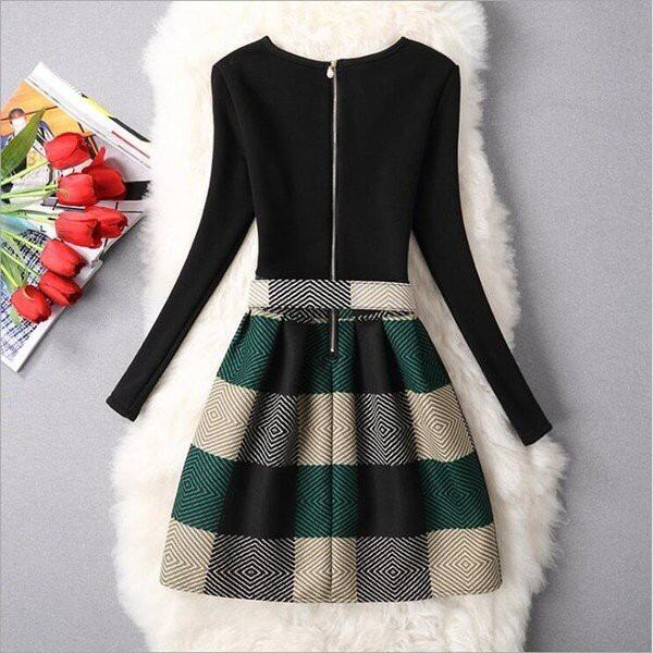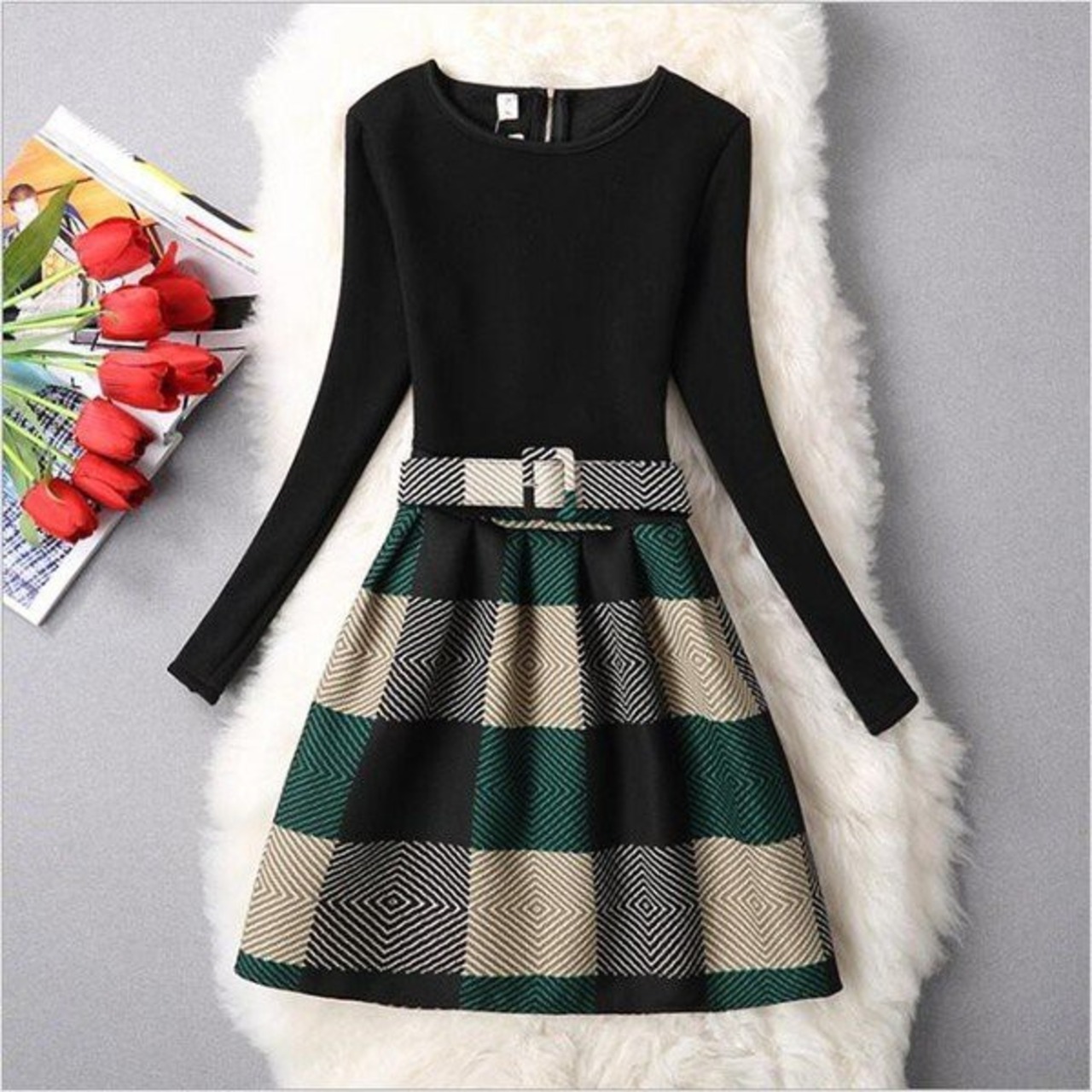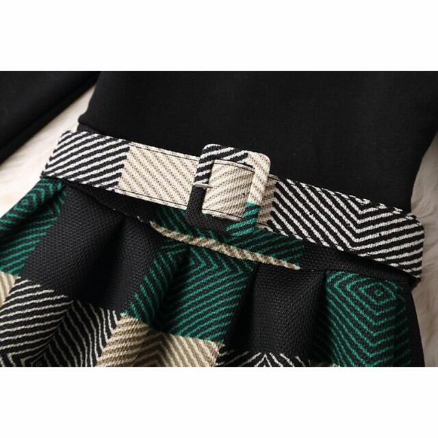 ワンピース レディース ドレス ワンピース ハイウェスト ベルト付き 春 冬 グリーン 裏起毛 ショート丈 ワンピ ママ 長袖 チェック柄 Aライン通勤 着痩