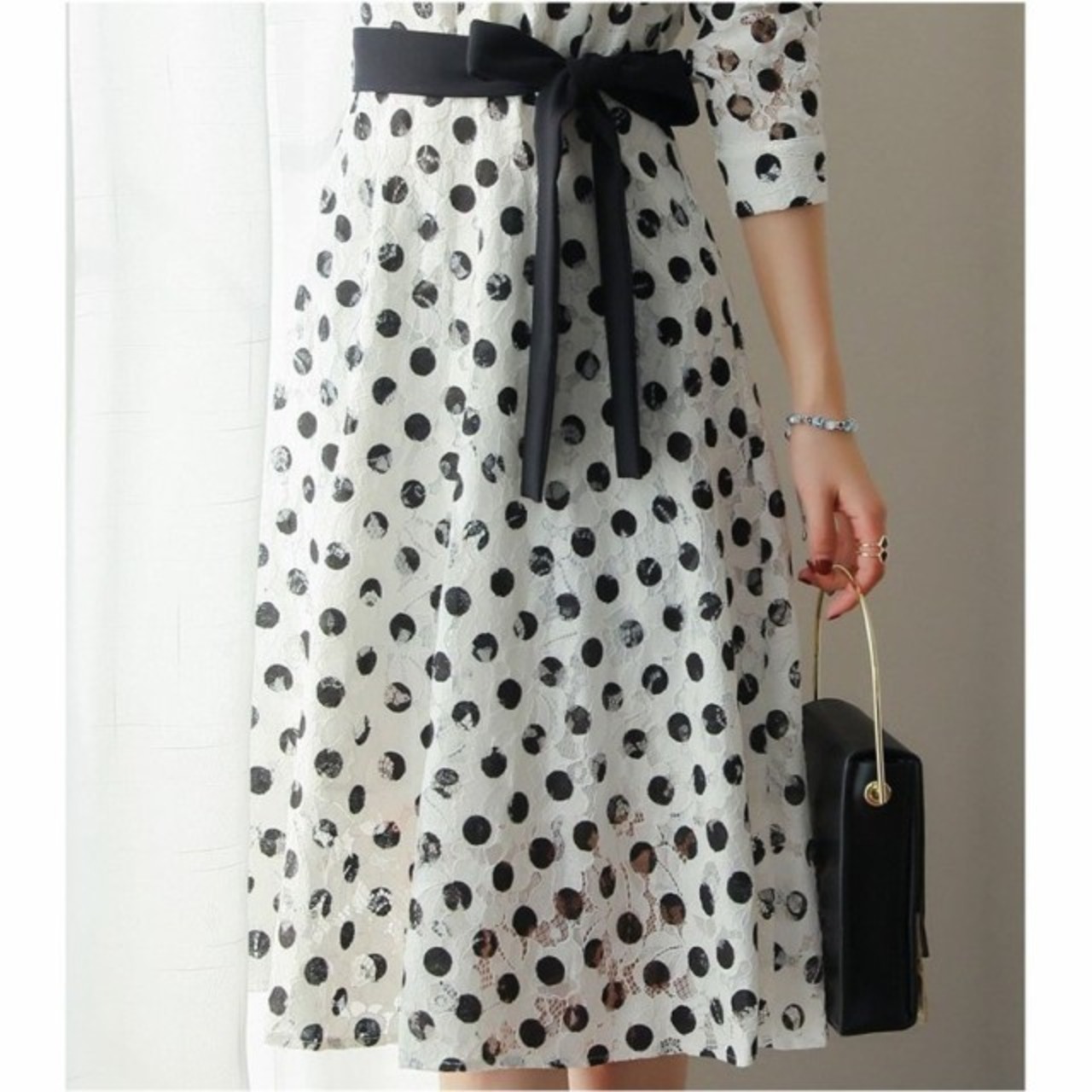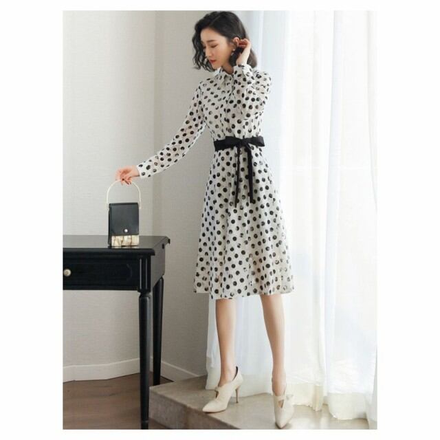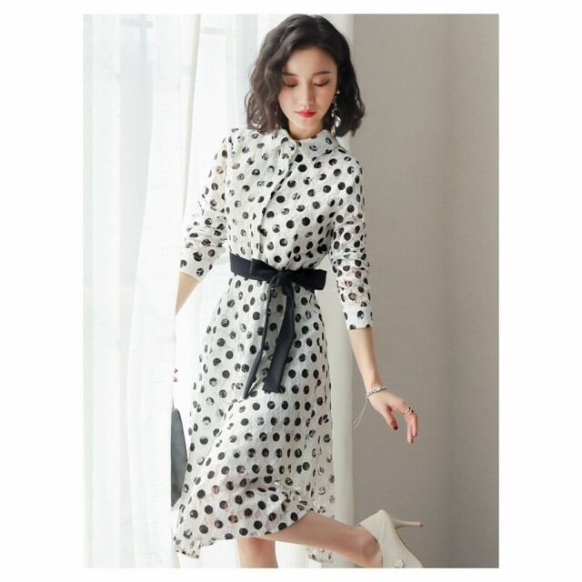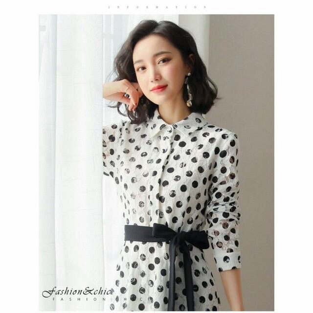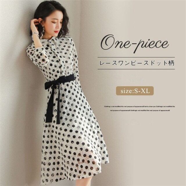 ワンピース レディース シャツワンピース 春 長袖 膝丈 フレア Aライン レースワンピース ドット柄 リボン フォーマル 入学式 卒業式 通勤 体型カバー おしゃれ
