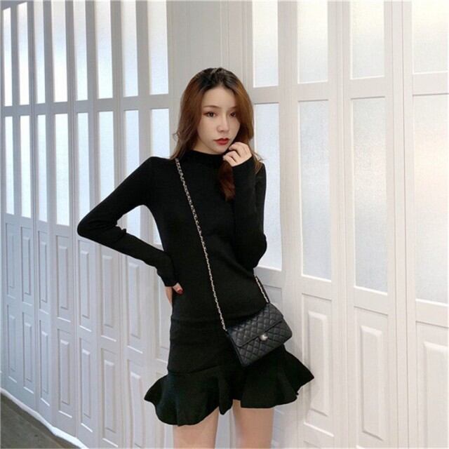 ニットワンピース レディース チュニック ミニ丈 ショート丈ワンピ 長袖 フリルスリーブ 細身 無地 秋冬
