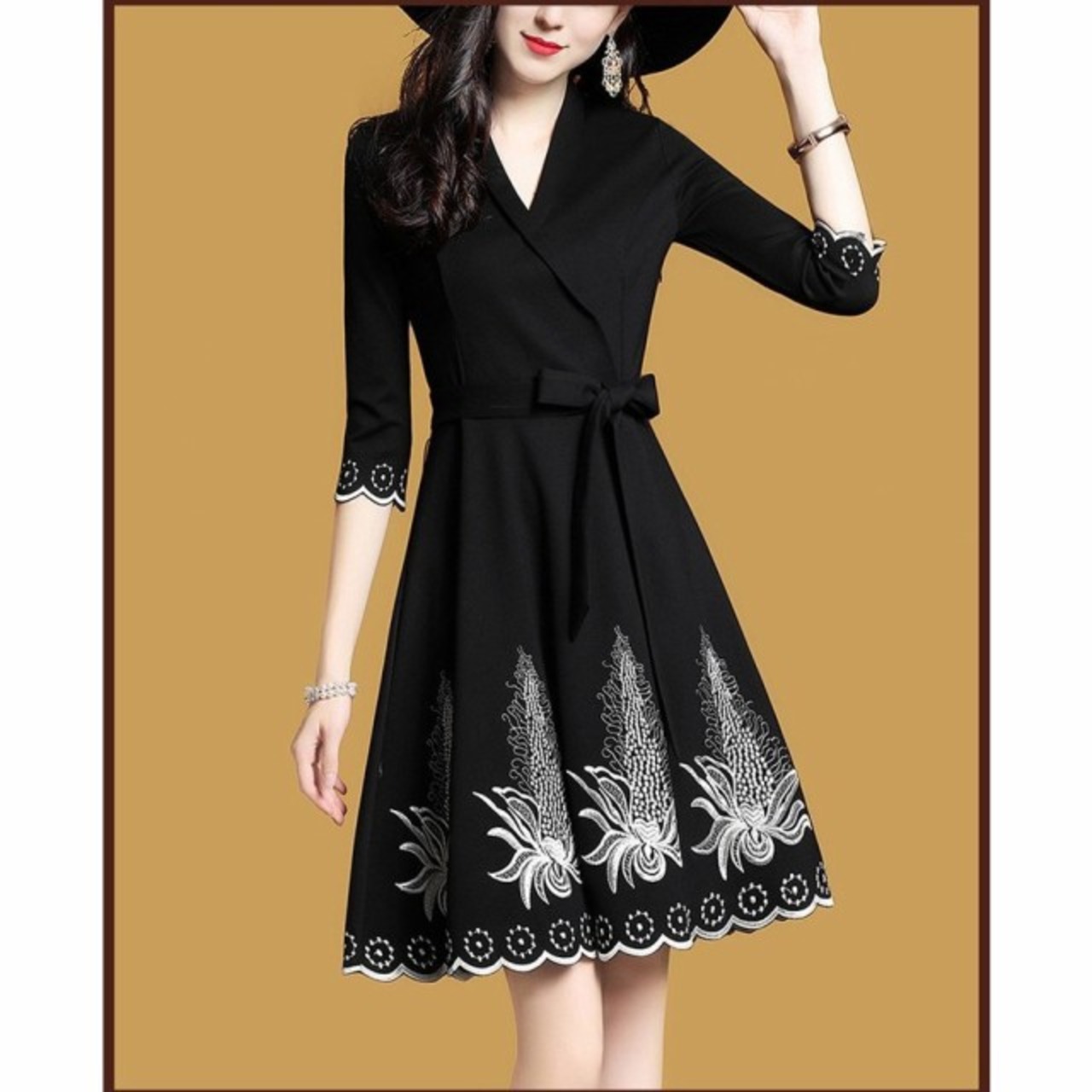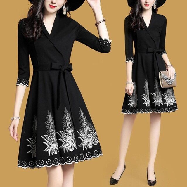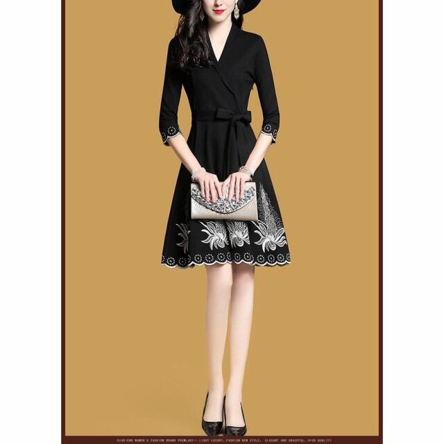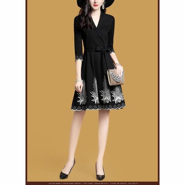 連携キーワード:ワンピース レディース 秋冬 きれいめ ワンピース 膝丈 七文袖 Vネック フレア 刺繍ワンピース 結婚式ドレス パーディドレス 通勤 着痩せ 新作