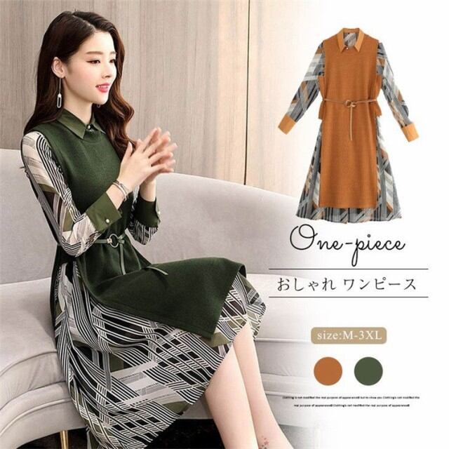 ワンピース レディース きれいめ ニットワンピース 2点セット ベストワンピース 膝丈 フォーマルワンピース おしゃれ 長袖 ひざ丈 大きいサイズ 春 夏
