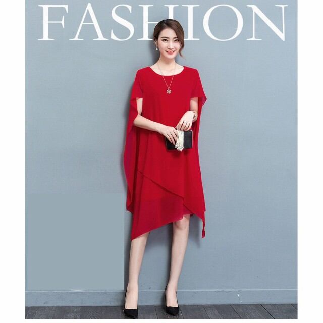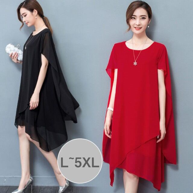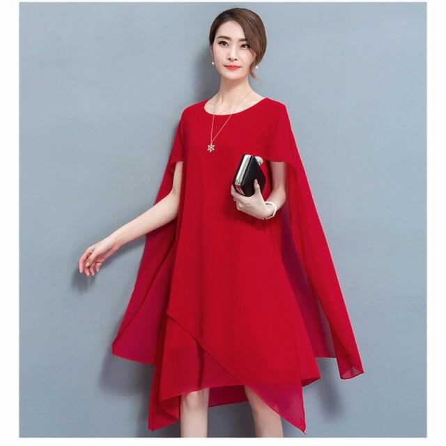 ワンピース レディース 春夏 膝丈ワンピースドレス 無地 大きいサイズ シフォンワンピース 体型カバー ミドル丈 マント式ワンピ オシャレ 上品 新作