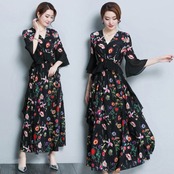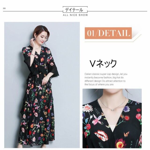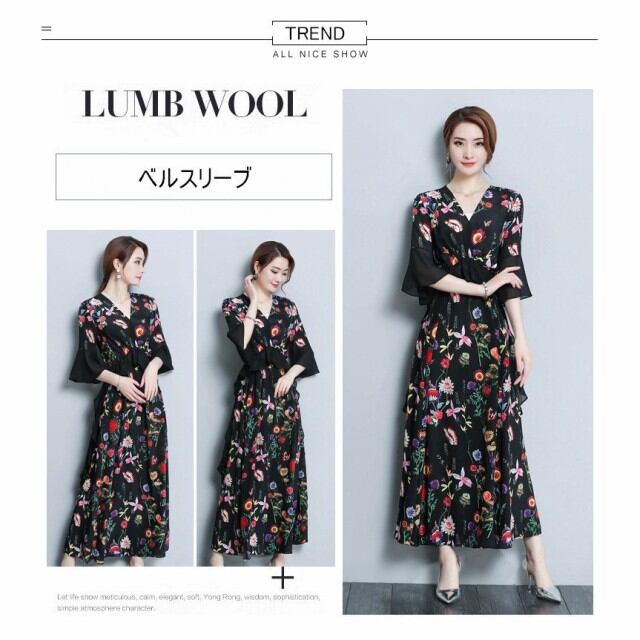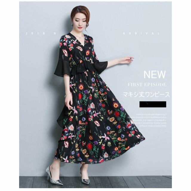 連携キーワード:ワンピース レディース 40代 春夏 きれいめ マキシ丈ワンピース 花柄 シフォン 大きいサイズ 七分袖 ベルスリーブ 黒 Vネック 結婚式ドレス 大人 ロング 上品