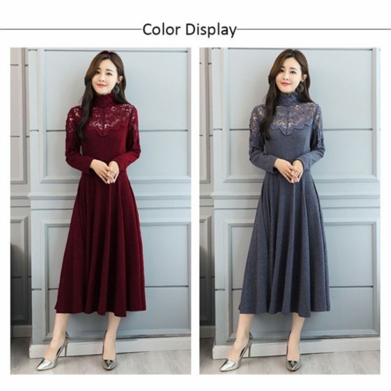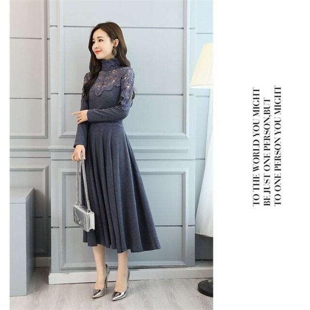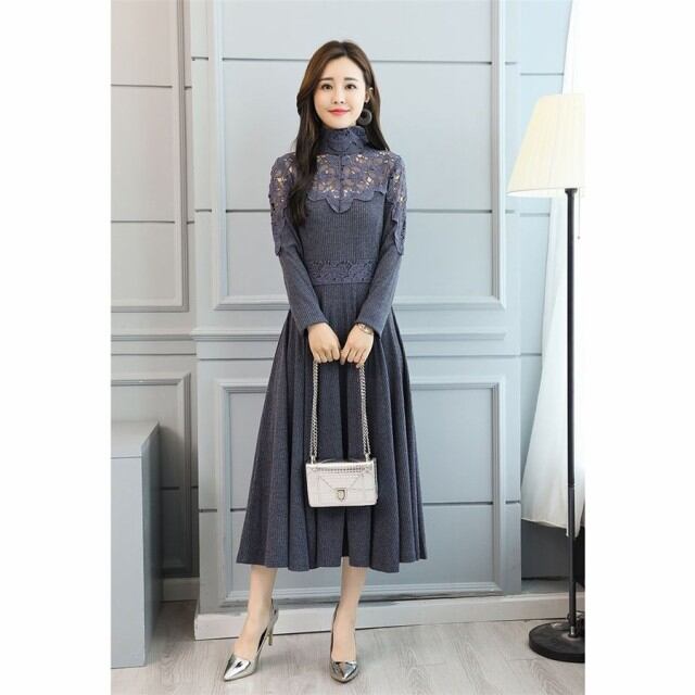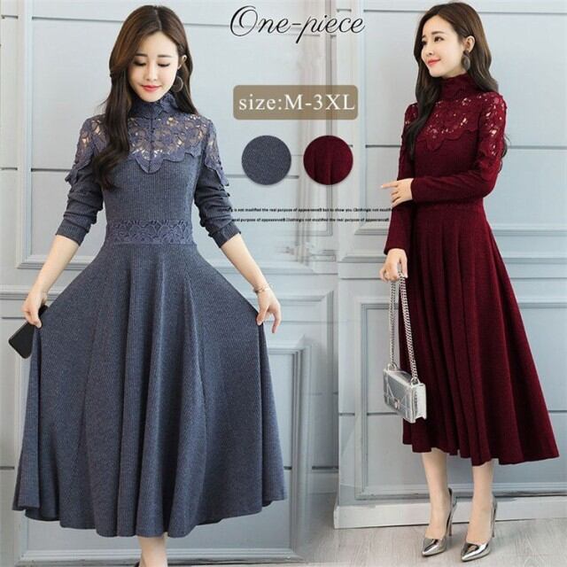 ワンピース レディース きれいめ ロングワンピース 長袖 マキシ丈 Aラインワンピース レース 秋冬 上品 無地 着痩せ 通勤 お出かけ 大人 オシャレ 40代