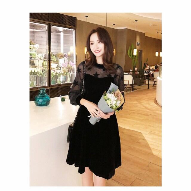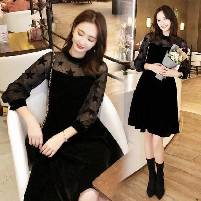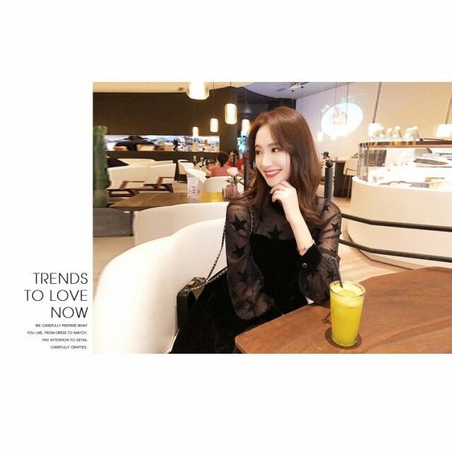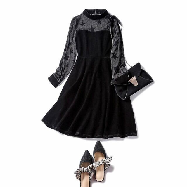 連携キーワード:ワンピース レディース 秋冬 膝丈ワンピース きれいめ 長袖 星柄 シースルーショート丈ワンピースドレス フレアスカート 通勤 着痩せ 結婚式 お出かけ 上品 オシャレ