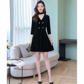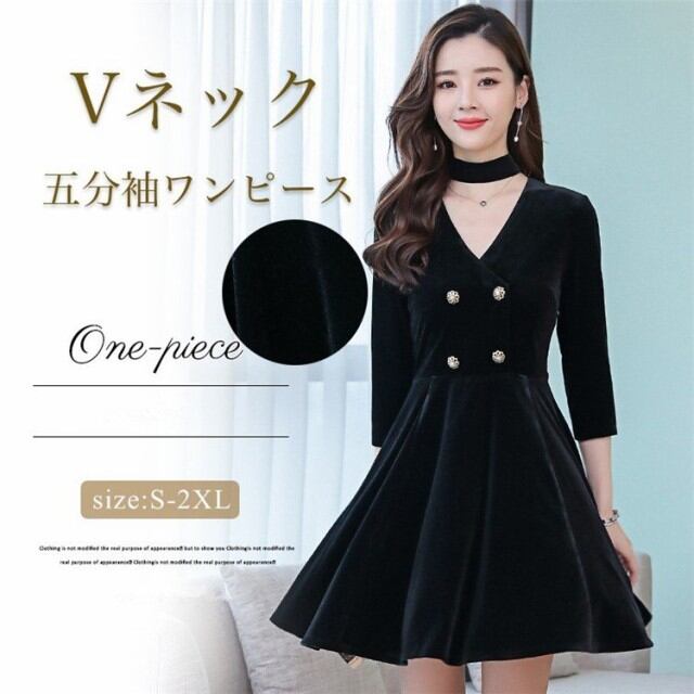 ワンピース レディース 春 膝丈 ひざ丈 Vネック 5分袖 フレア Aライン 無地 ベルベット きれいめ おしゃれ フォーマルワンピ 体型カバー 大きサイズ 40代 30代