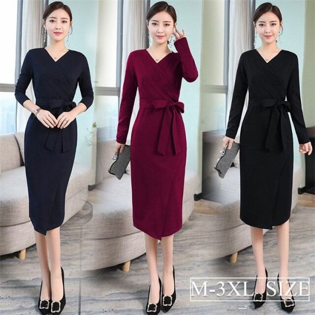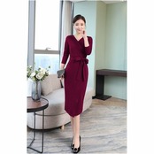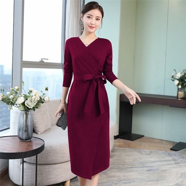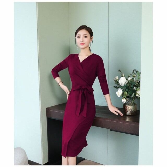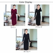 ワンピース レディース きれいめ ロングワンピース 膝丈 長袖 Vネック ベルト付き 着やせ 上品 おしゃれ フォーマル 通勤 入学式 春 無地 30代 40代