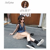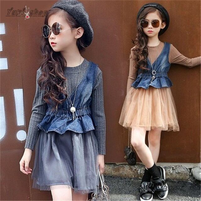 子供服 女の子 長袖 ワンピース 2点セット 子ども キッズ ジュニア 春秋服 ニット チュール 切り替え布 ワンピース デニム ベストファッション感 大人気