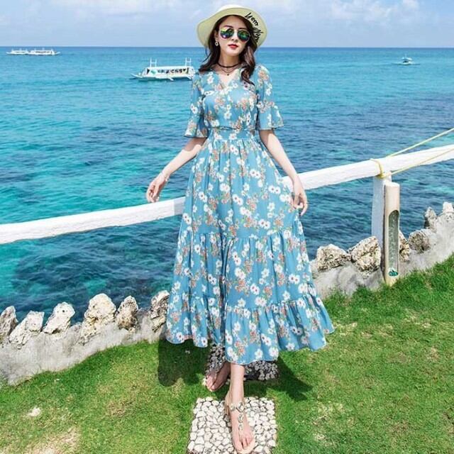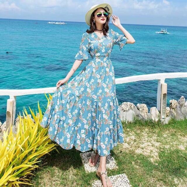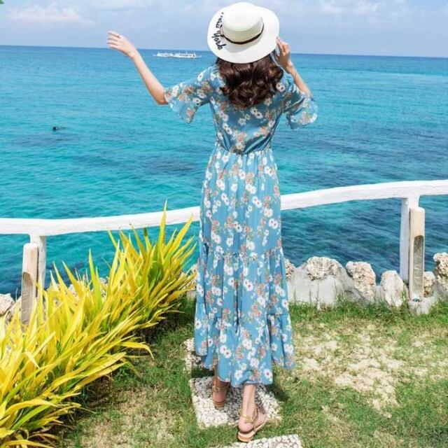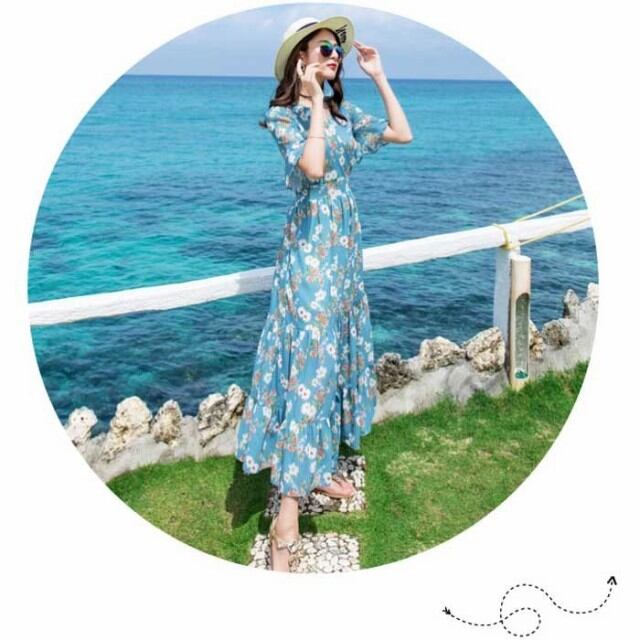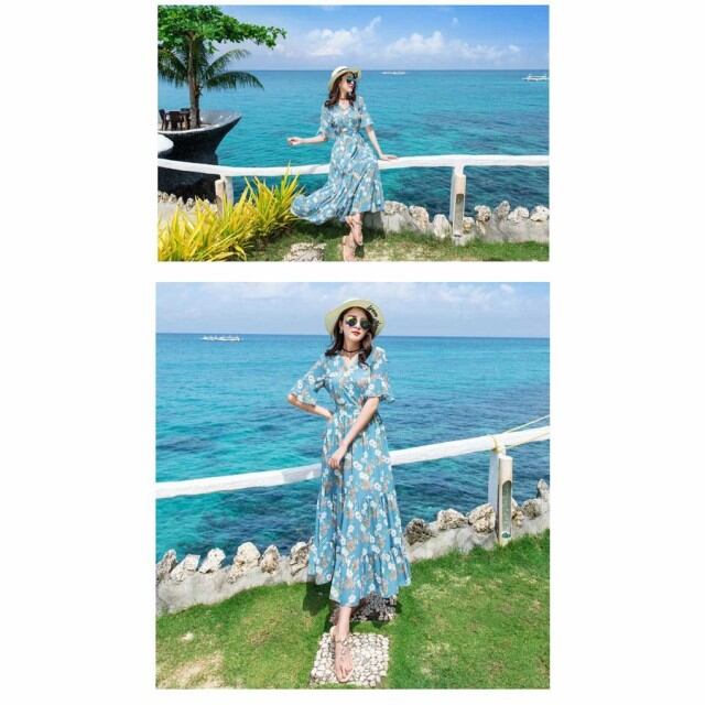 春夏レディース Vネック ー きれいめ シフォン サンドレス エスニック ハイウエスト リゾート マキシ丈 ワンピース ビーチ ロングスカート 上品 大人