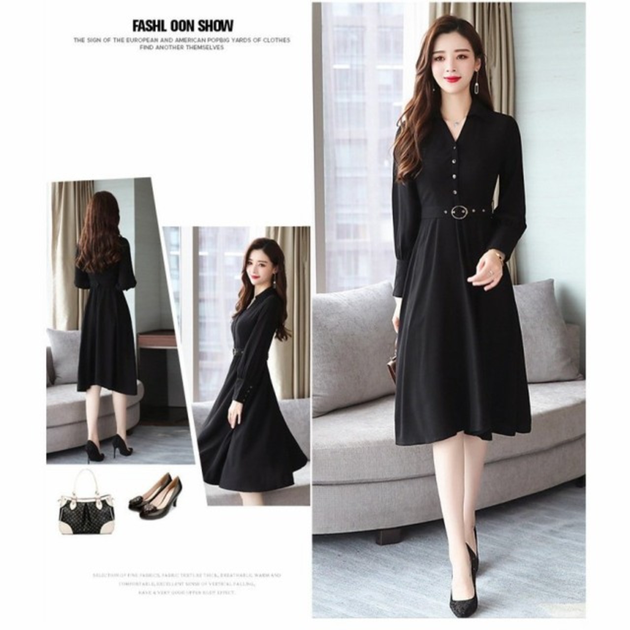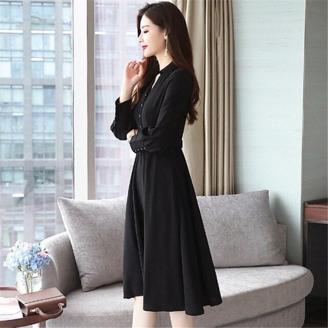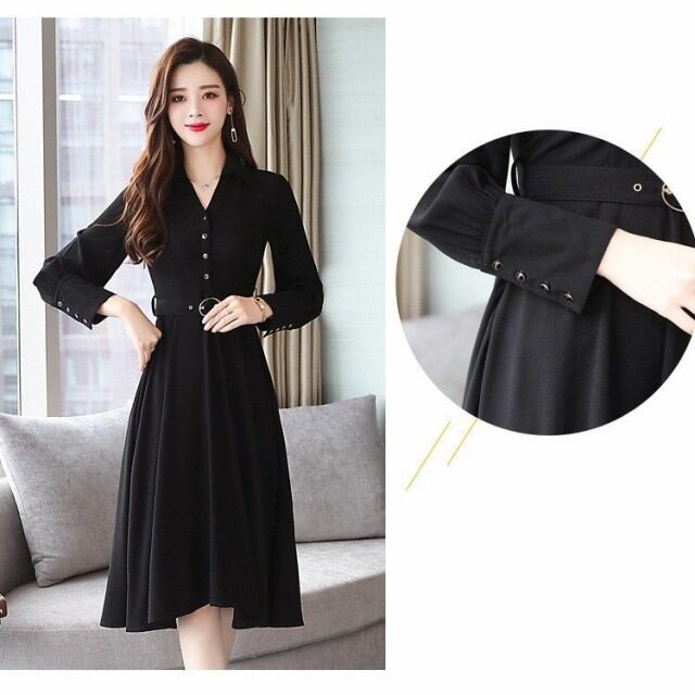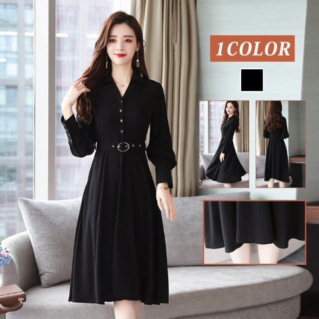 ワンピース レディース 春秋 マキシ丈ワンピース きれいめ 長袖 シャツ風ワンピース 無地 ベルト付き Vネック 黒 マキシ丈ドレス 通勤 オシャレ 着痩せ ロング