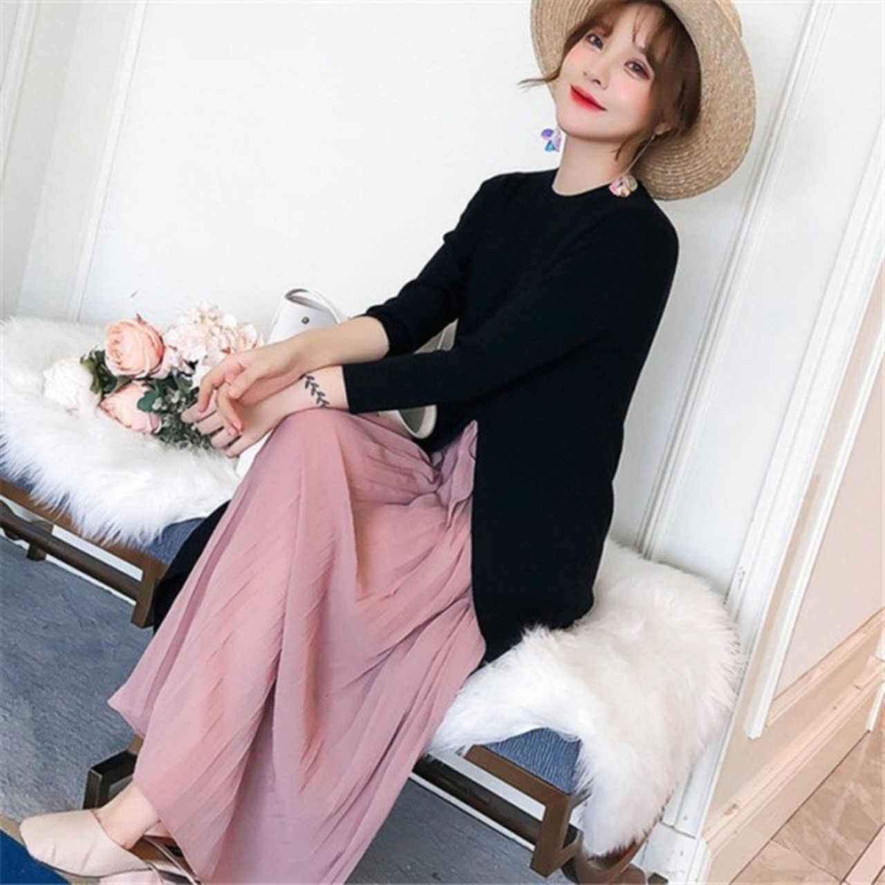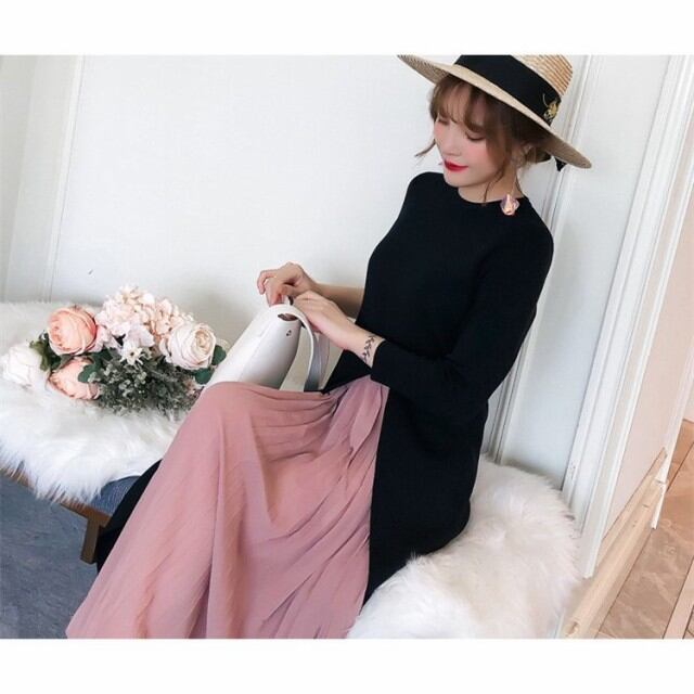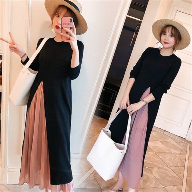 プリーツ入りニットワンピース レディース ワンピース ニット ロング 長袖 マキシ スリット プリーツ ブラック 20代 30代 40代 マタニティ
