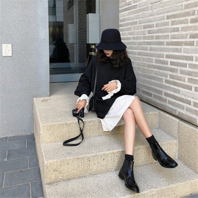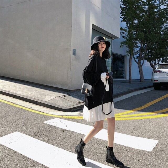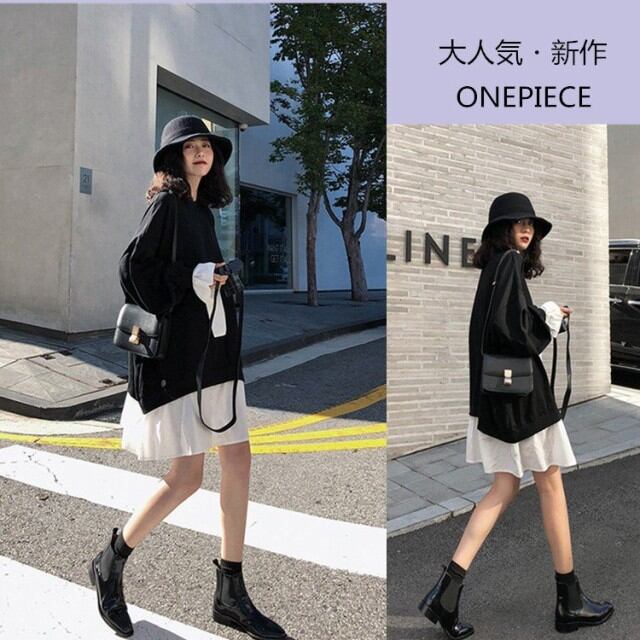 ワンピース レディース 切り替えワンピース 丸ネック 膝丈 ロング 長袖 ゆったり 体型カバー バイカラー 袖フレア トップス