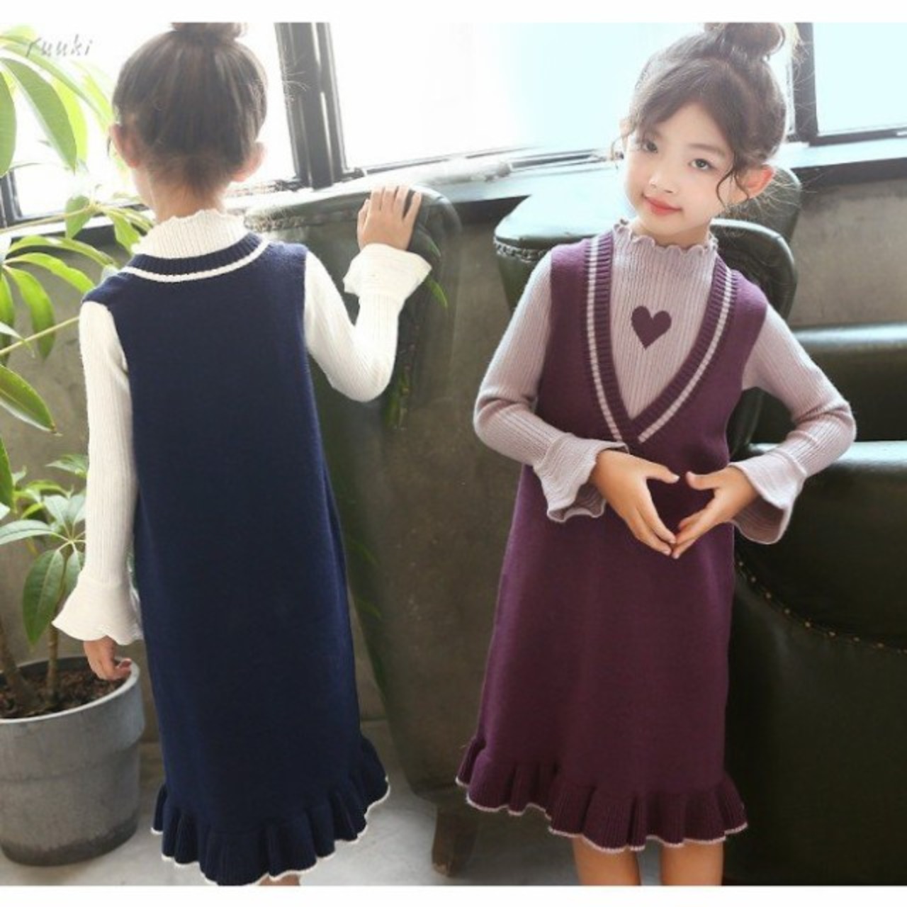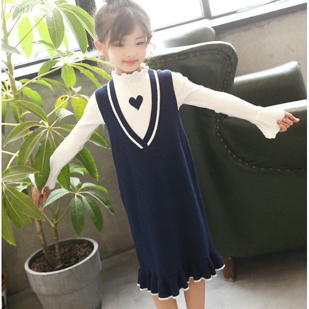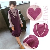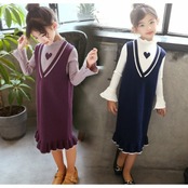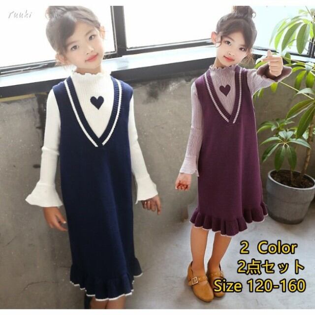 子供服 女の子2点セット ニットワンピース 春秋 長袖ワンピース キッズワンピース ストライプ 可愛い 子ども 韓国風ワンピース