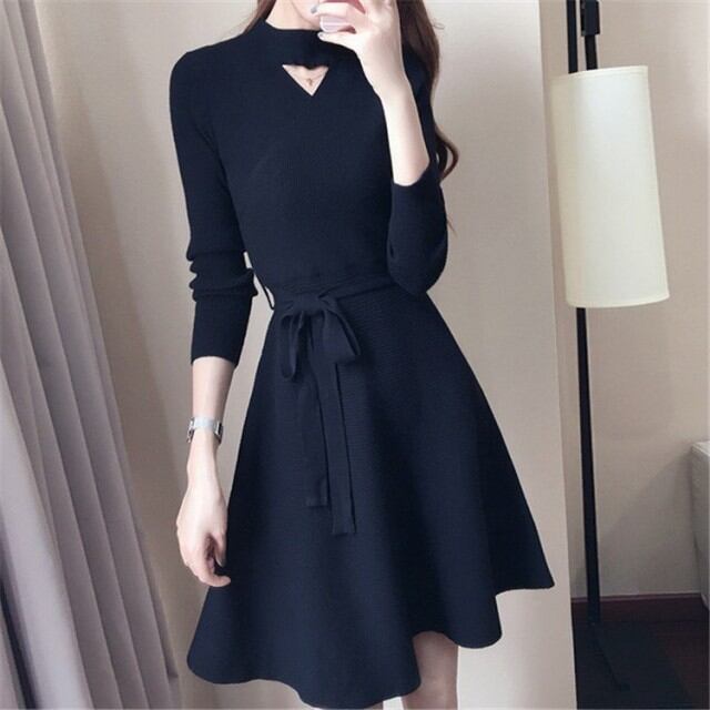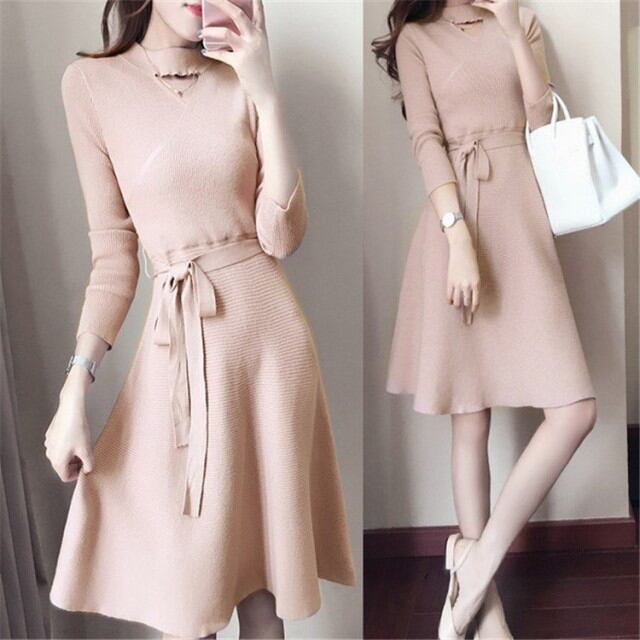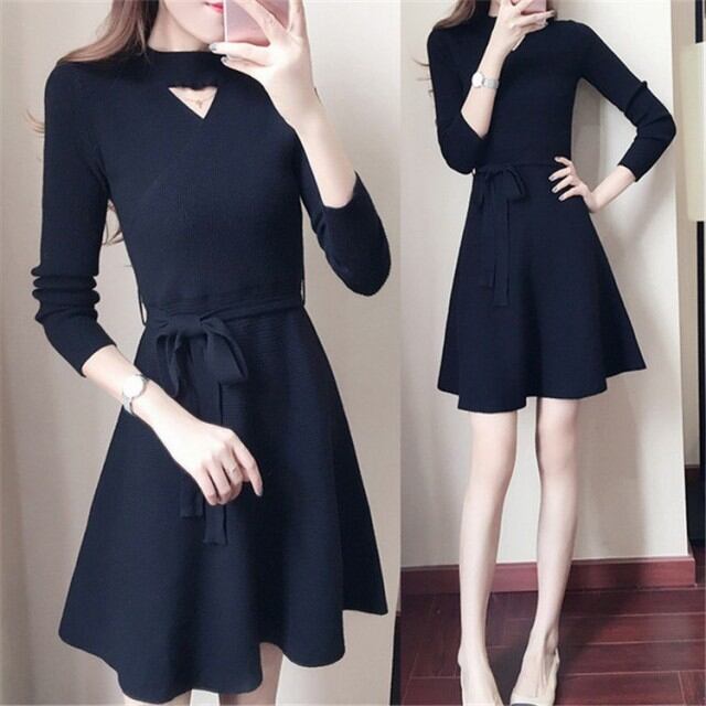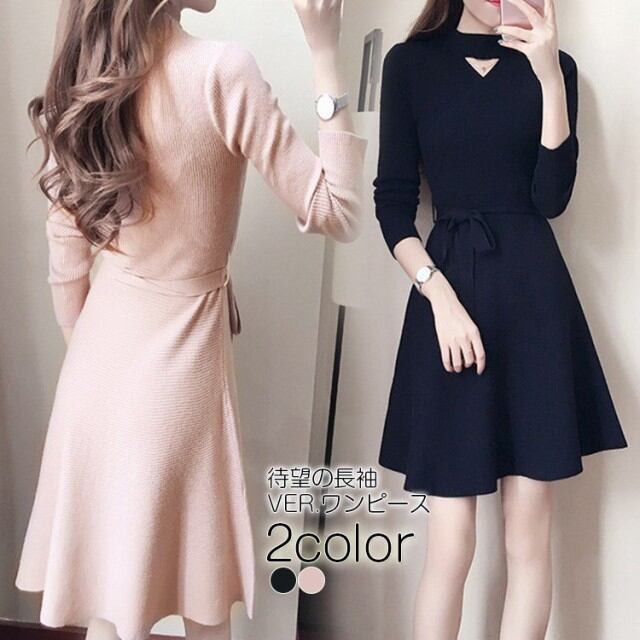 ワンピース Vネック Aライン ゆる フレア ワンピース チュニック 秋冬 大きいサイズ 体型カバー ニットベルト付き ンプル 秋 冬
