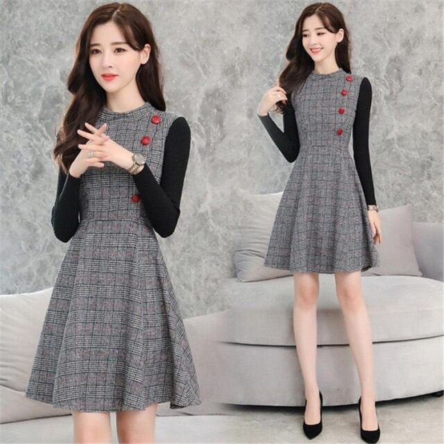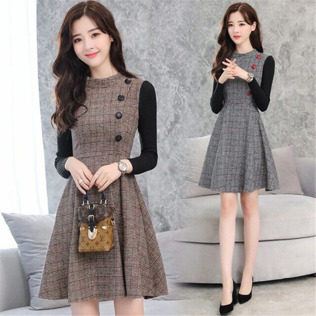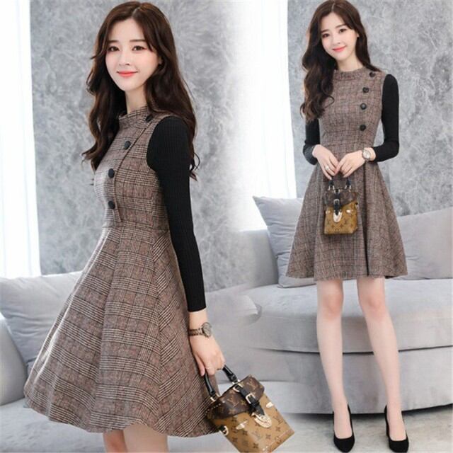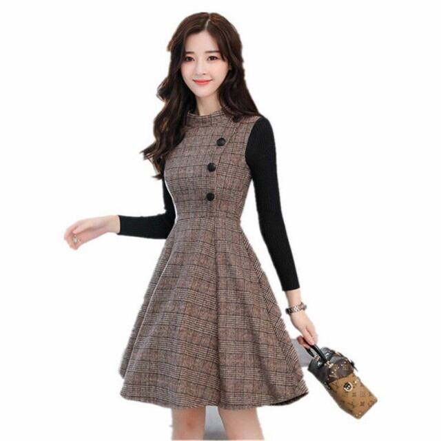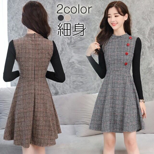 ワンピース レディース 秋冬 膝丈ワンピース きれいめ ワンピース チェック柄 ニット切替ワンピース 結婚式 ツイード 大人可愛い