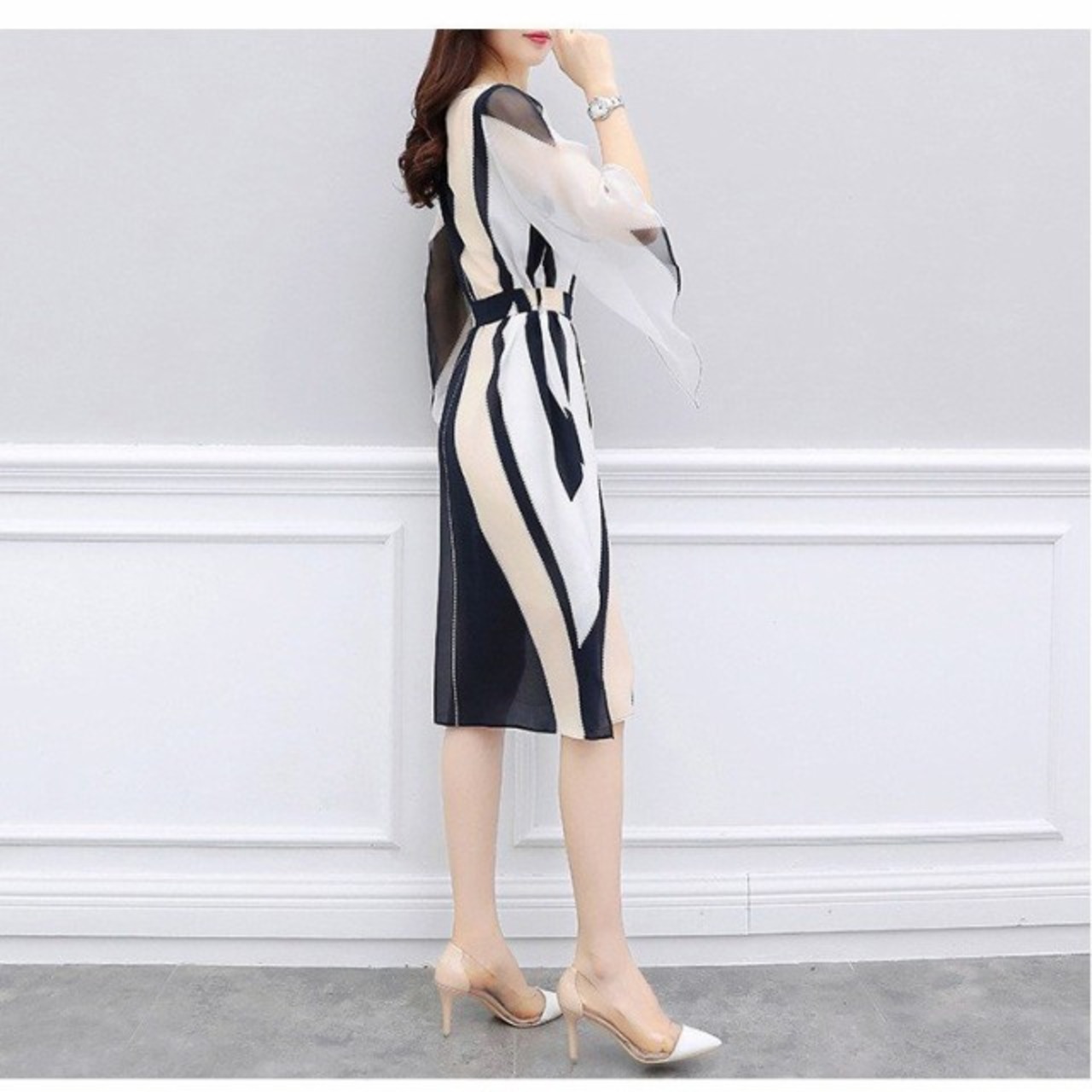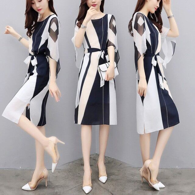 連携キーワード:ワンピース レディース 40代 春夏 膝丈ワンピース きれいめ シフォンワンピース スピーカースリーブ 配色 リボン付き 大きいサイズ 通勤 OL 着痩せ オシャレ 上品 新作