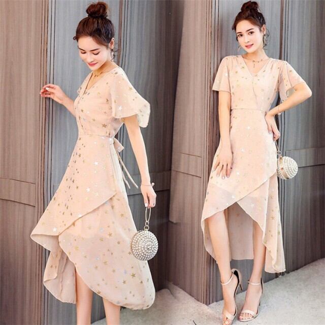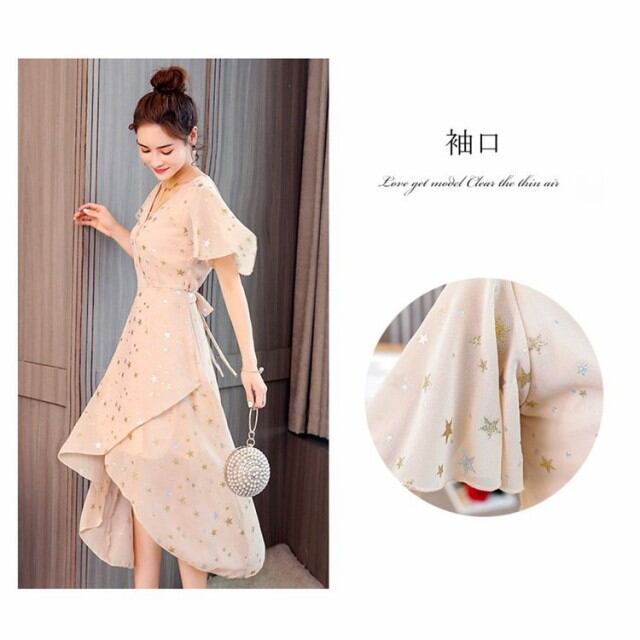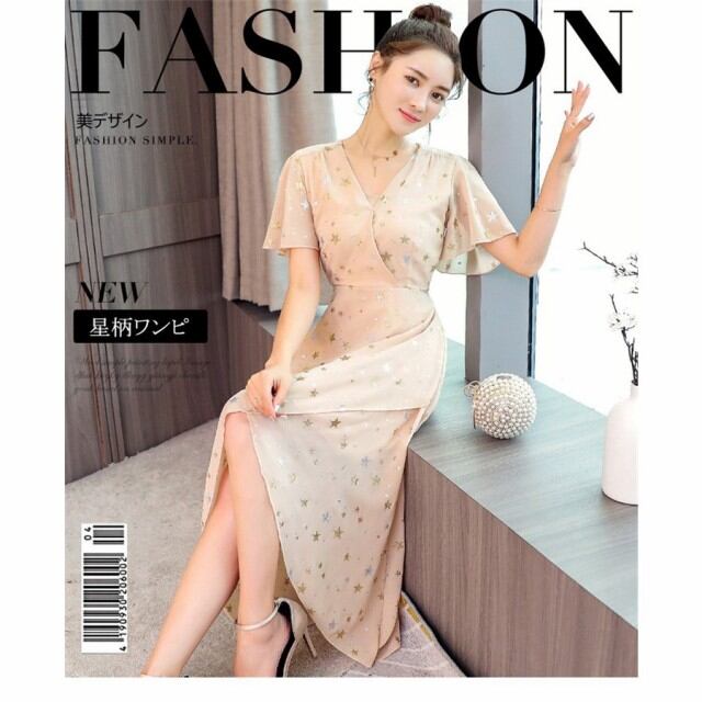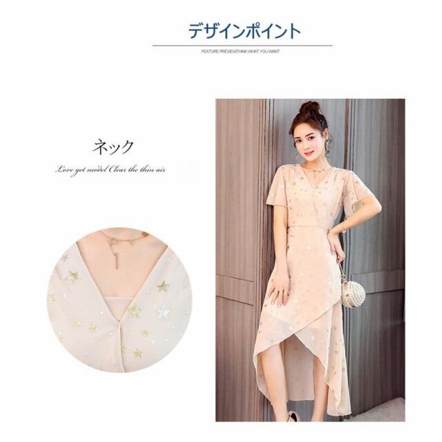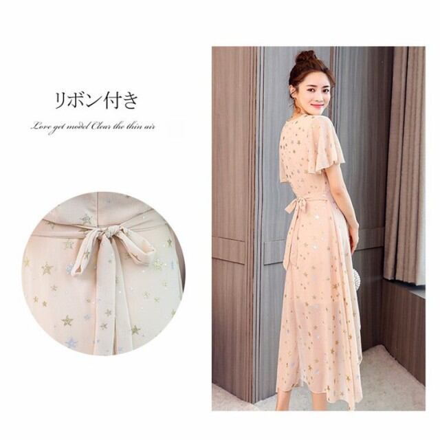 連携キーワード:ワンピースドレス レディース 春夏 きれいめ 結婚式 ワンピース マキシドレス シフォン 星柄Vネック 上品 ロング丈 パーティー 膝丈ドレス オシャレ 大人