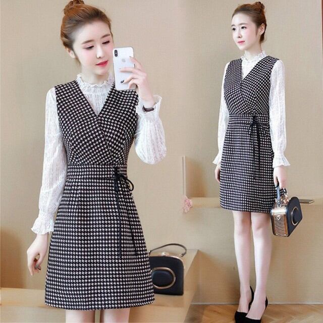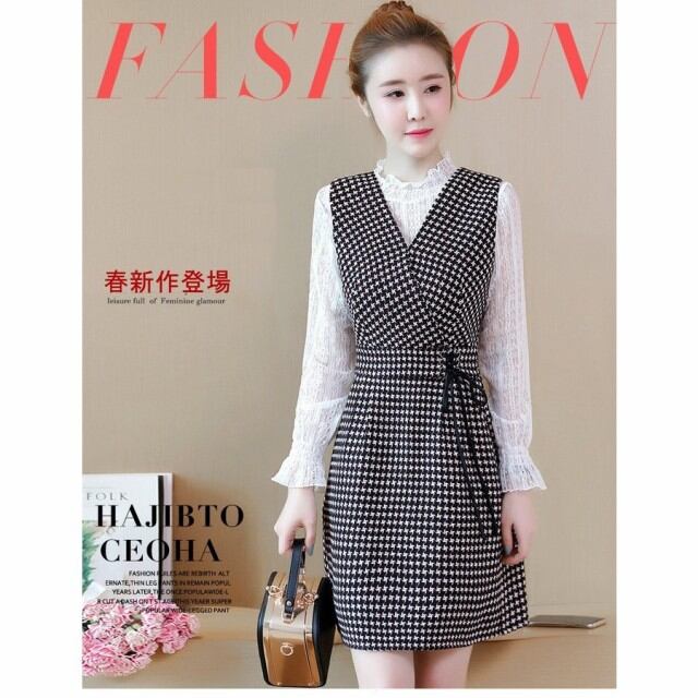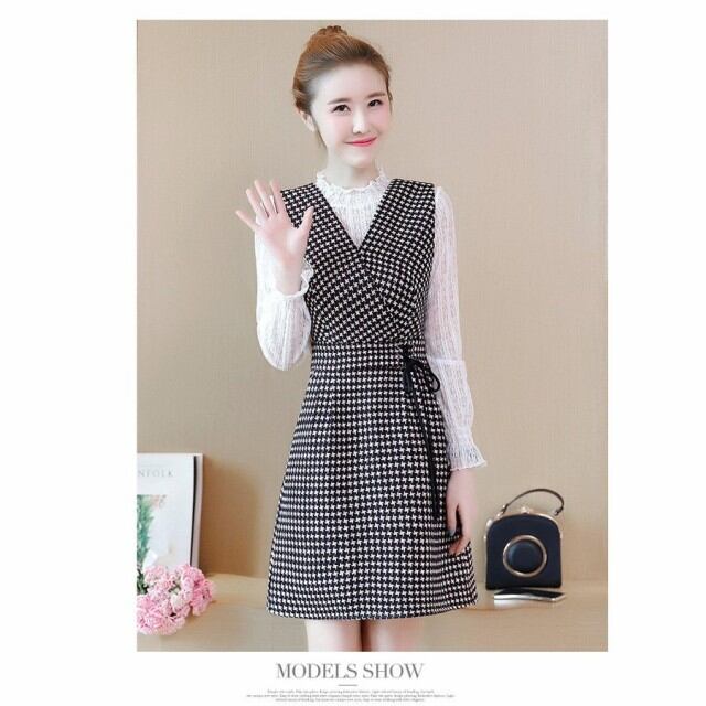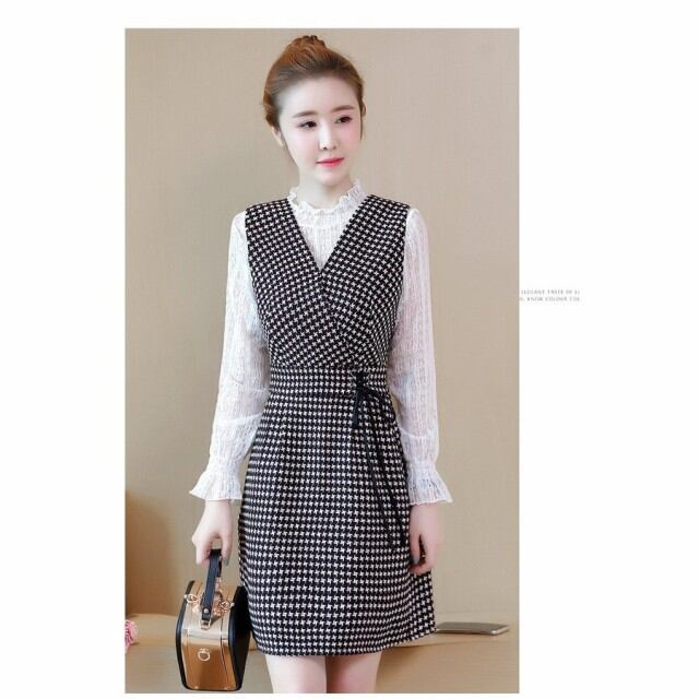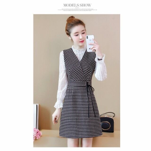 連携キーワード:ワンピース レディース Aラインワンピ 2点セット レース チェック柄 きれいめ V襟 膝丈ワンピ 着痩せ 通勤 OL オシャレ 春 上品 新作