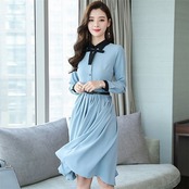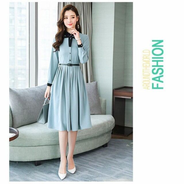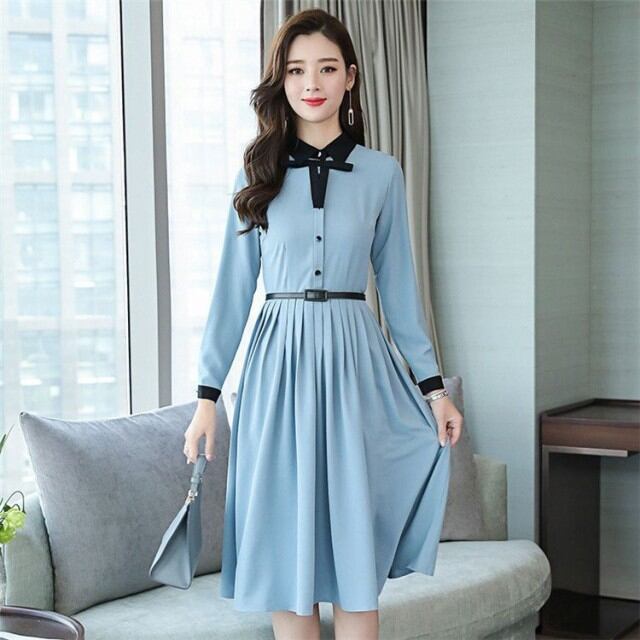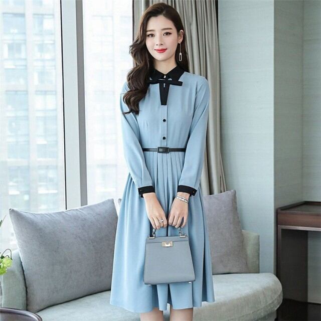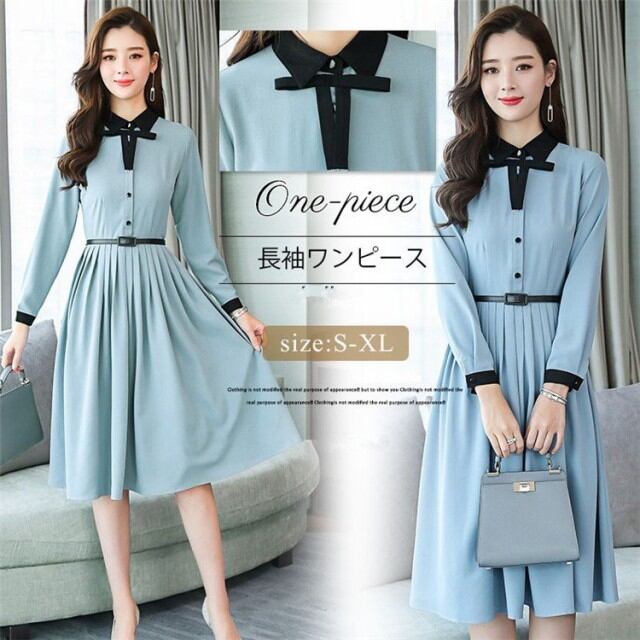 ロングワンピース レディース ワンピース 春夏 長袖 膝丈 ミモレ丈 プリーツ 無地 体型カバー ロングワンピ フォーマルワンピース ベルト付 30代 40代 20代