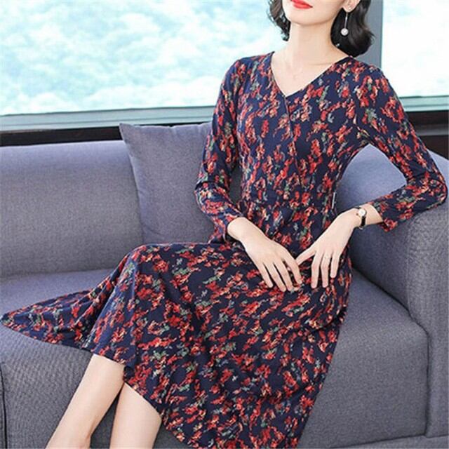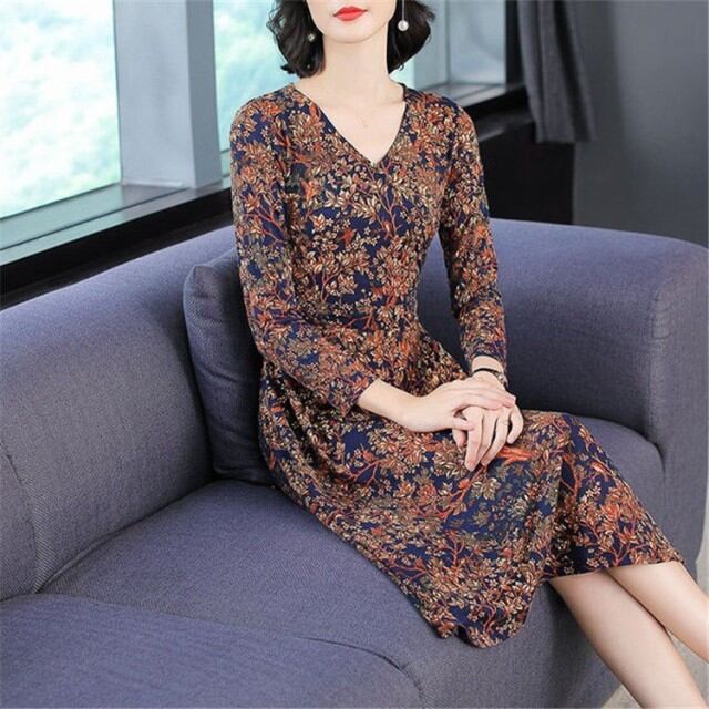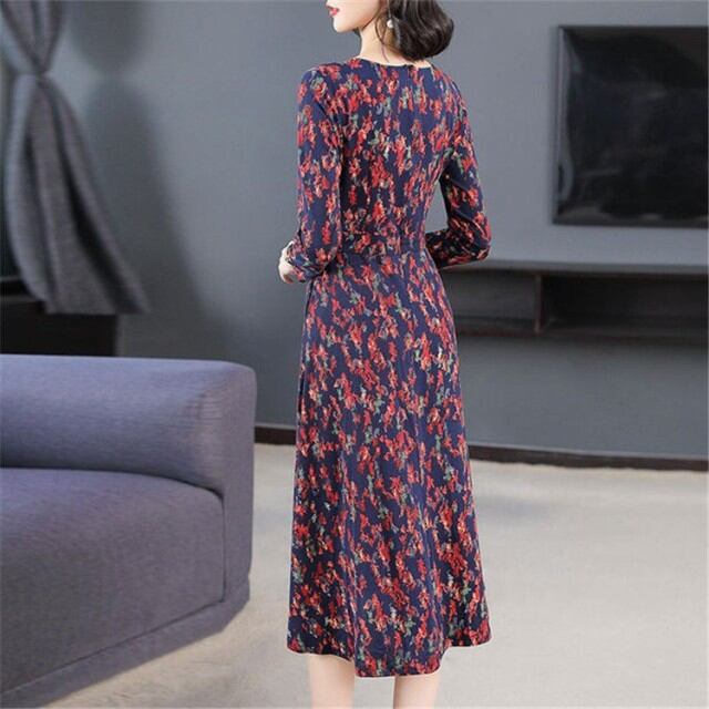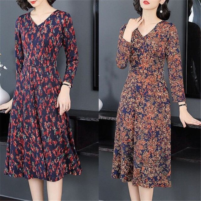 レディース 花柄 ボウタイ 春ワンピ 長袖 膝丈 大人かわいい レトロ シフォン シャツワンピース フラワー プリーツ裾 ロング丈 通勤 OL ワンピース