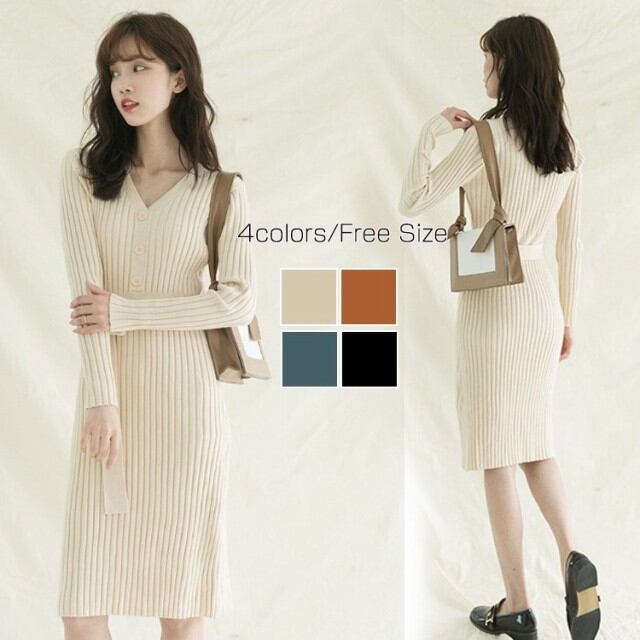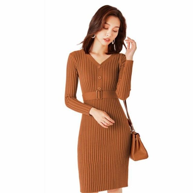 ワンピース ニットワンピース サイドスリット ロング Vネック リブニット レディース ベルト付け