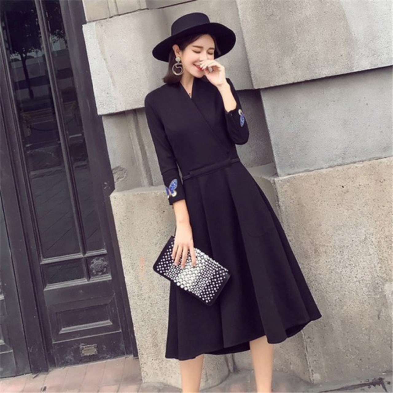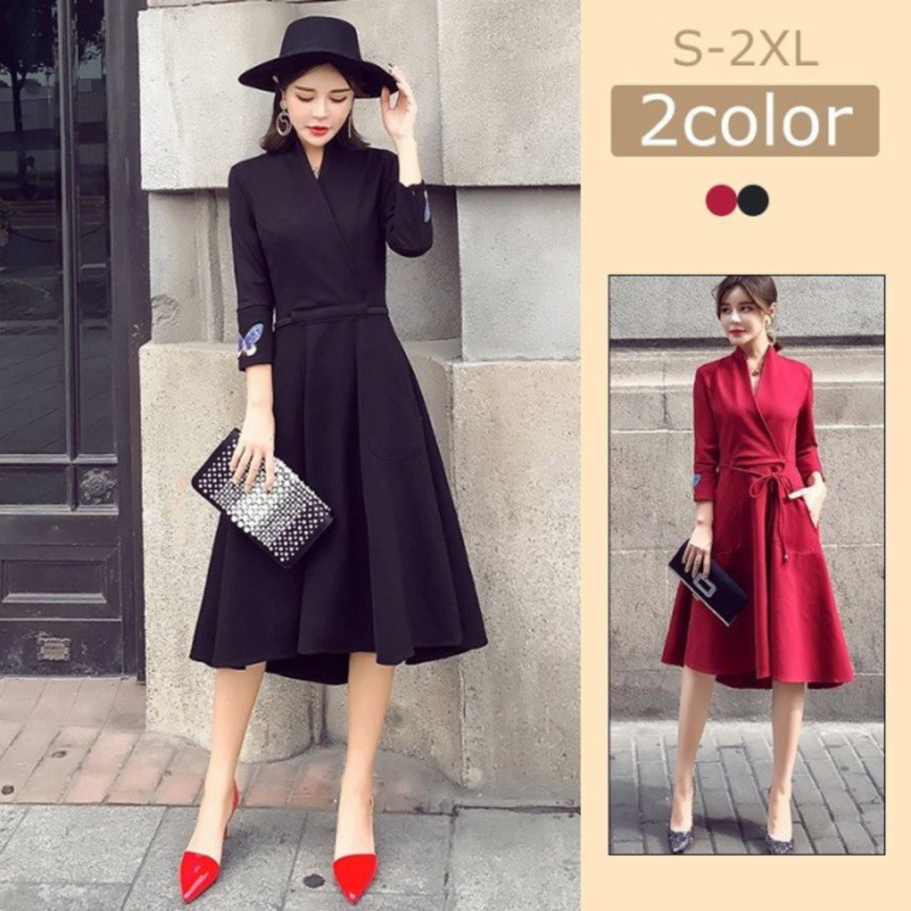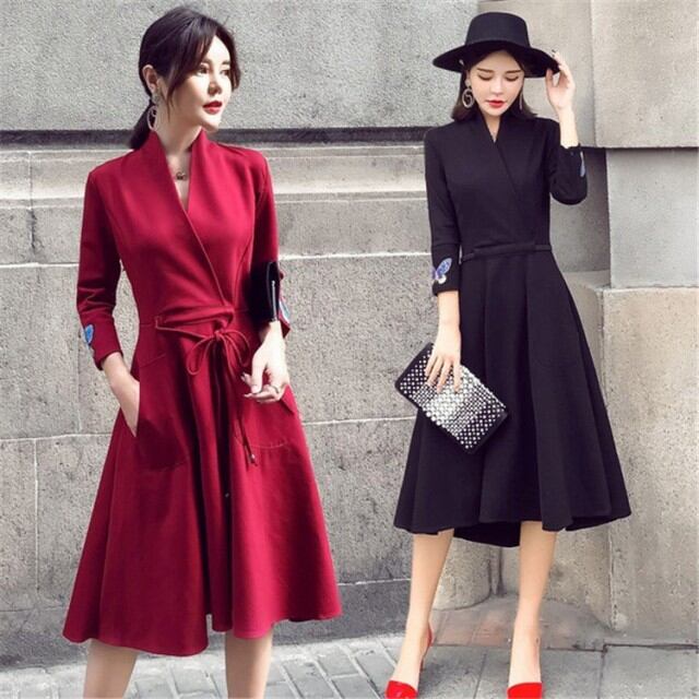 ワンピース レディース40代 秋 きれいめ Aライン 膝丈ワンピース 大きいサイズ 上品 七分袖 Vネック リボン 無地 膝丈ワンピース ロング 着痩せ オシャレ 2色