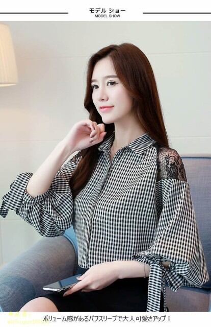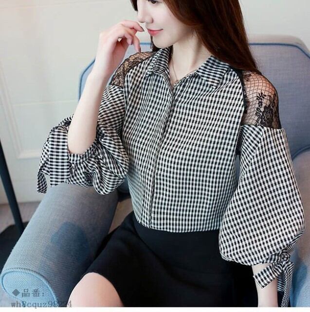 ブラウス レディース 7分袖 レース 春 チェック柄 秋 夏 2019春新作 ゆったり Vネック トップス オープンショルダー