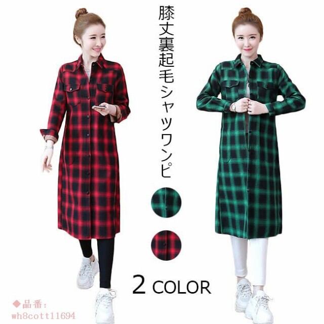 裏起毛シャツワンピ レディース 膝丈 ミモレ丈 長袖 チェック柄 ゆったり ワンピース トップス アウター 春 夏 秋 2018春新作
