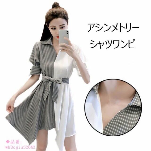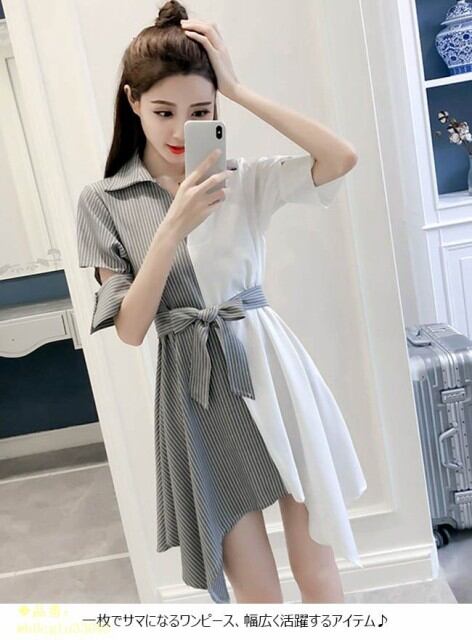 シャツワンピ レディース ストライプ柄 リボン アシンメトリー ショート丈 ミニ丈 半袖 ゆったり ワンピース オールインワン 春 夏 秋 2018春新作