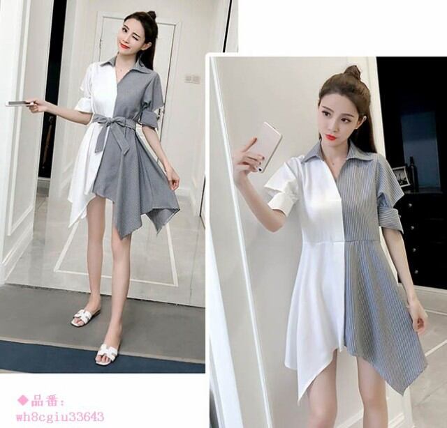 シャツワンピ レディース ストライプ柄 夏 ショート丈 リボン 2018春新作 ゆったり 春 オールインワン アシンメトリー 半袖 ワンピース 秋 ミニ丈